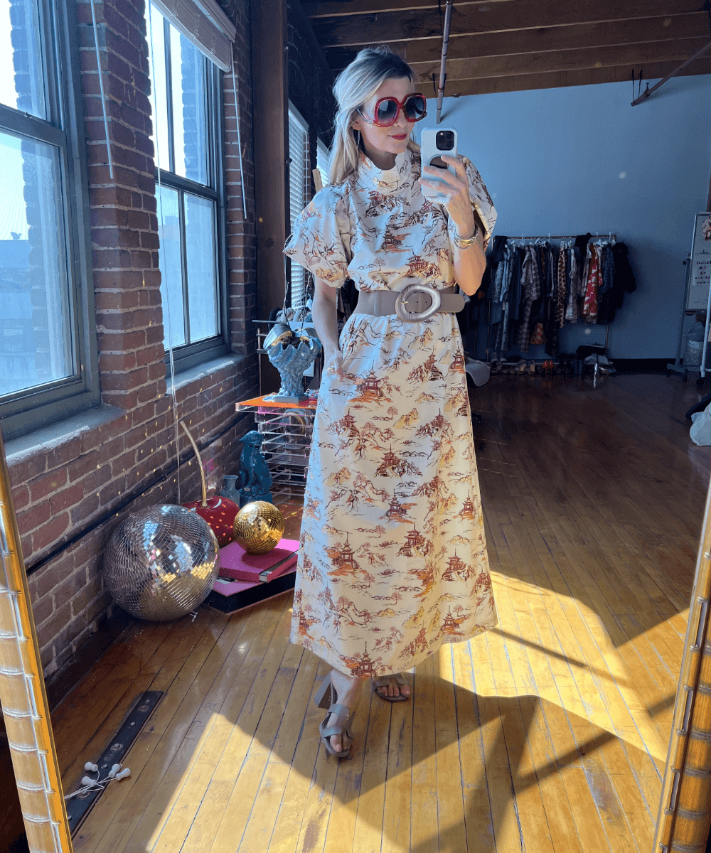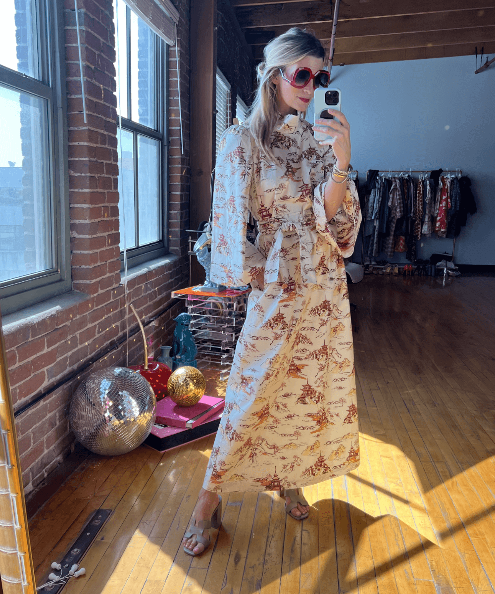 The Maxi Mod Dress may be a newer silhouette for us, but this one packs a multi-look punch! She still features a classic mock turtleneck and buttons up the back, but this new chinoiserie print style boasts a statement-making bell sleeve that can also be rolled and attached to a surprise shoulder button, transforming the dress into a puff sleeve gown. She can be cinched at the waist with her self belt, or worn sans belt for a true maxi style - she is a jack-of-all trades in the chicest form.