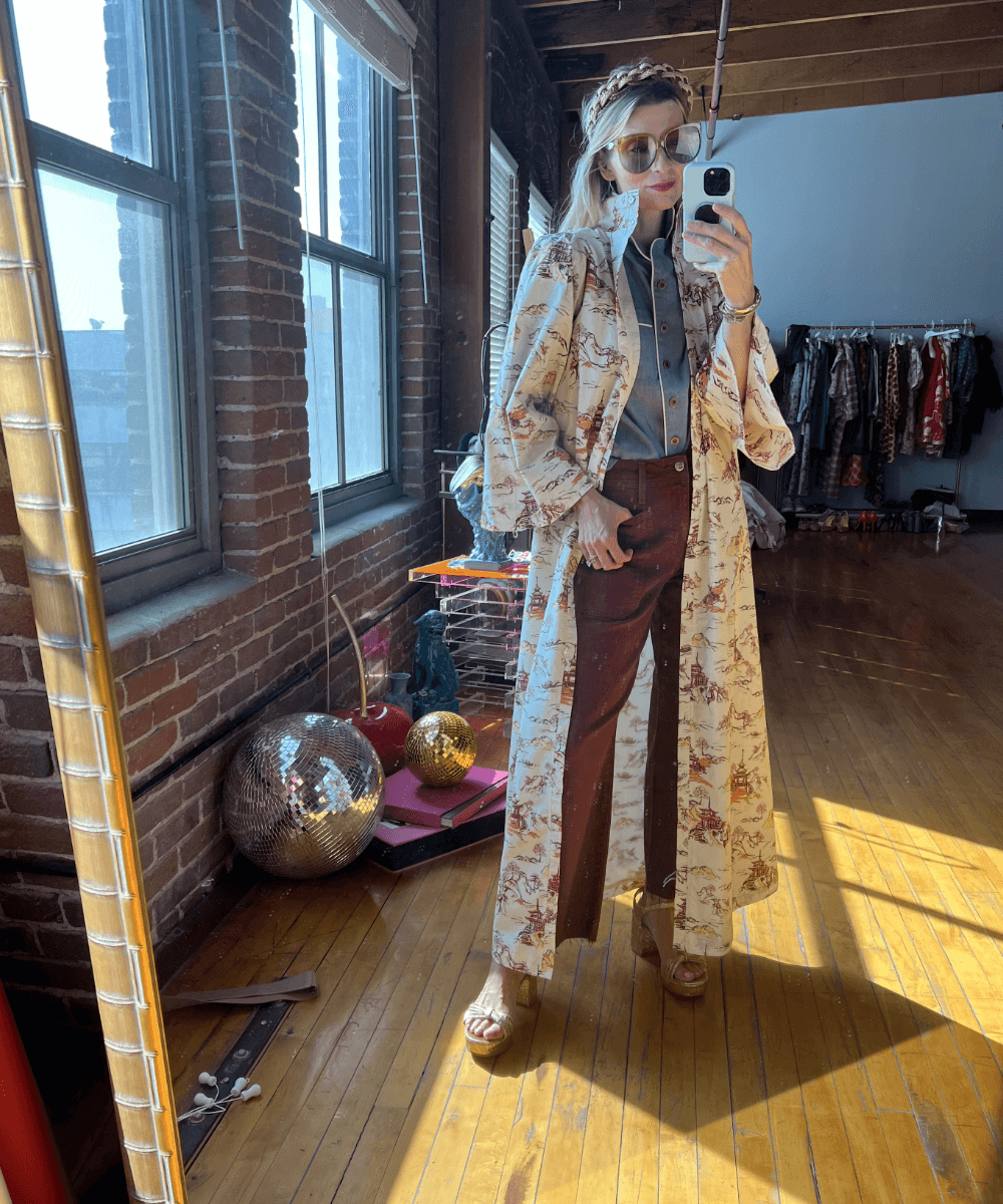Make a bolt statement with the bell sleeves and self belt double tied and knotted in the front.