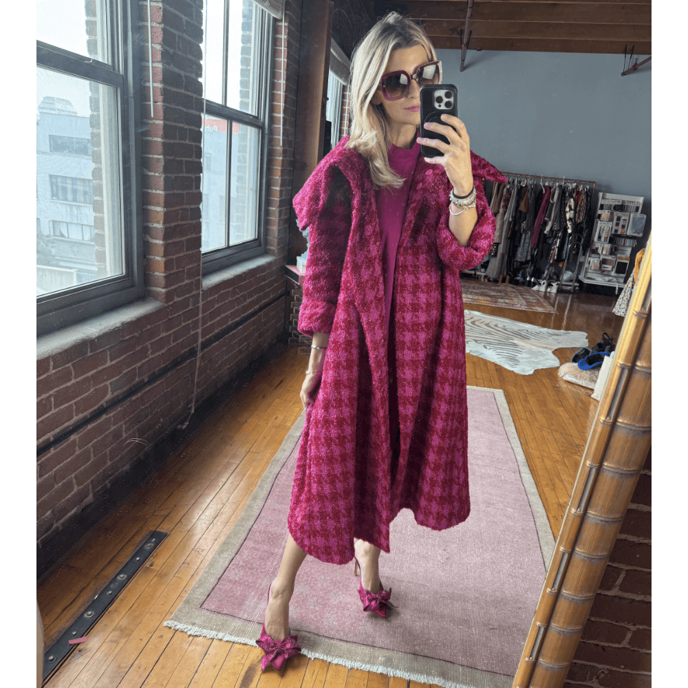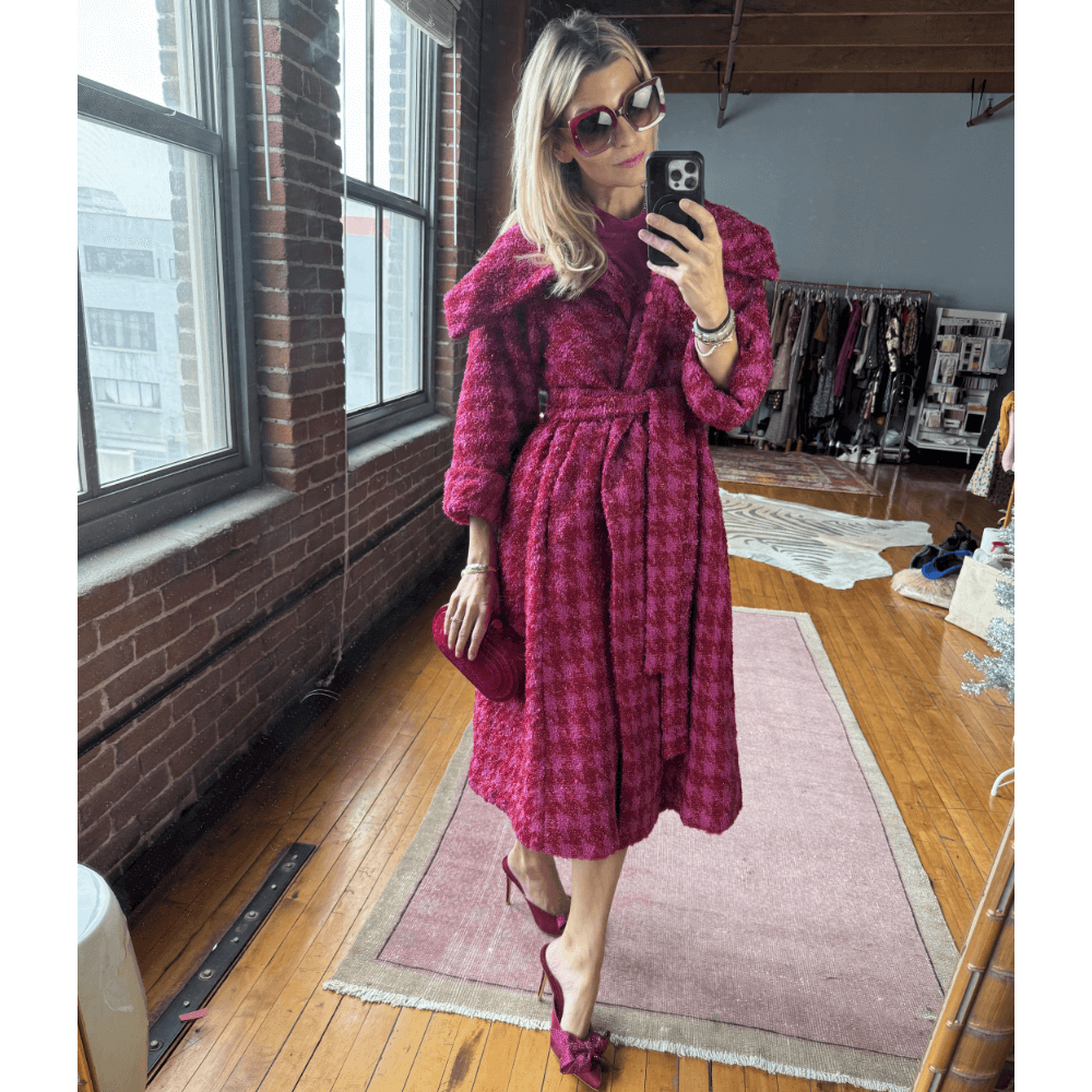 Named after Grace Kelly, this elegant coat knows how to make an entrance - just as she did. In a stunning houndstooth tweed and a bold mix of pink and red, the Grace Coat is a spin on our classic car coat. With added length for drama and a full sleeve, this bold outerwear style also converts to a dress with its included self belt + slip (or nothing if you're feeling frisky).