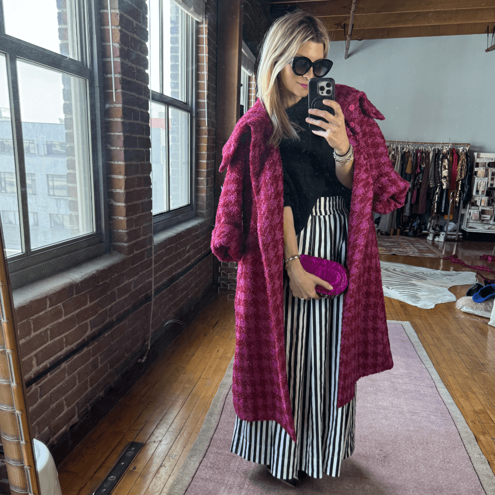 A black and white foundation with a combo of our Smocked Waist Skirt and Fisherman Sweater makes the bold pink and red tweed Grace Coat pop. A look that is stylish and warm.