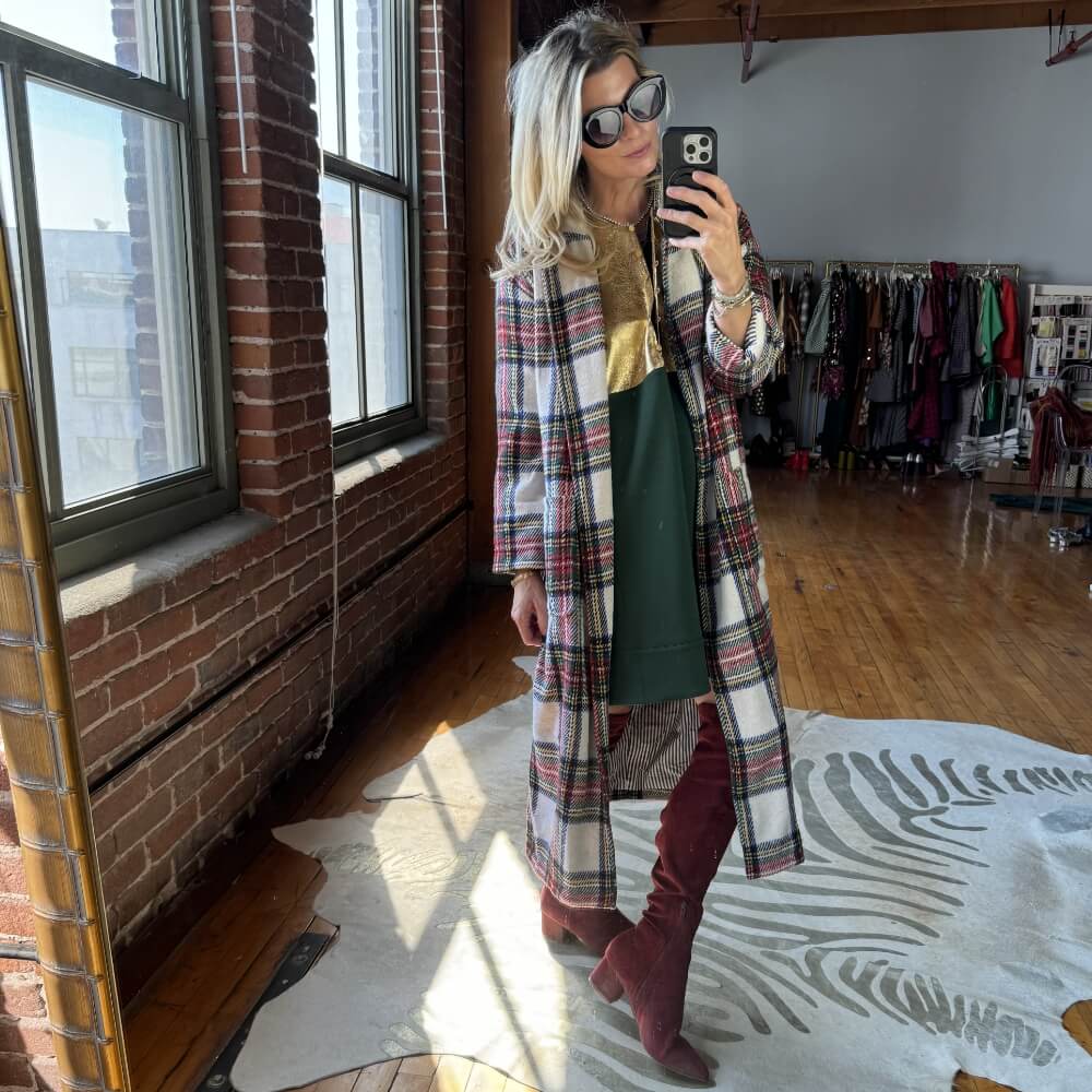 Throw on our plaid open car coat to really tie in all of the Holiday colors. Such an easy dress to layer, especially into the cooler evenings.