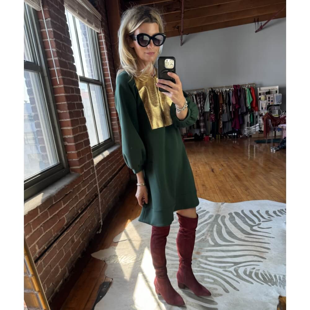 This stunning emerald bib front dress pairs perfectly with our over the knee suede cranberry boots for that Fall look. Great day to night transition!