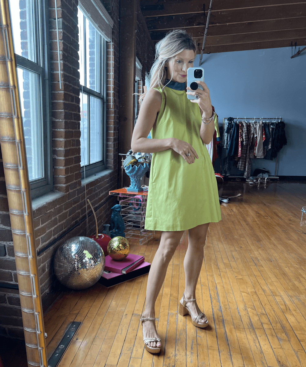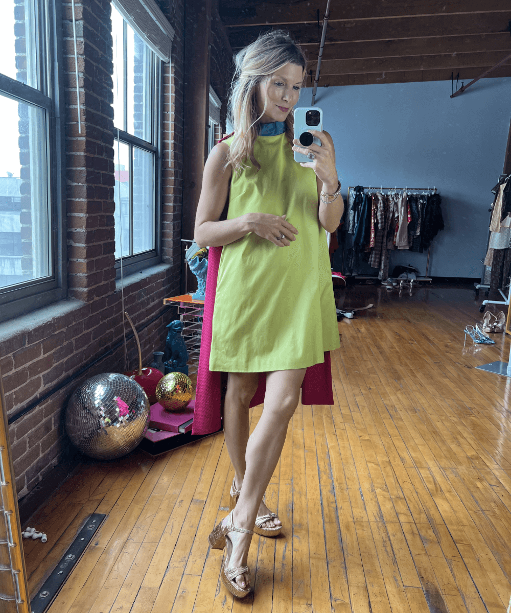 What is more empowering (and fun!) than your very own super hero cape! Completely detachable with vintage gold buttons, this dress is as versatile as it is special, practical, and magical. In a chartreuse cotton textile, with a textured fuchsia cape, this seasonless dress brings IT. Dress her up with fun statement heels for date night or leave the cape behind and toss on some ballet flats for your everyday errands.