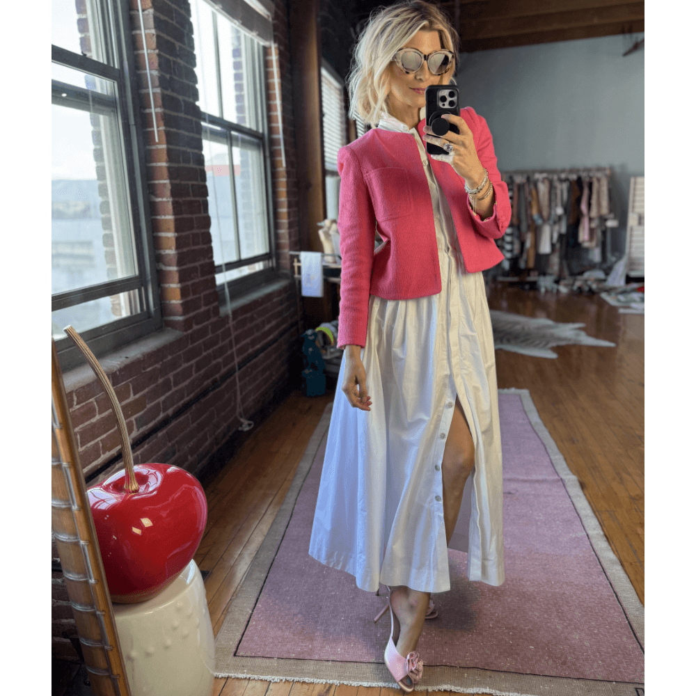 The beauty of buying a set is that it instantly gives exponentially more outfit options. Styling the bubblegum pink blazer over our classic white shirtdress creates the easiest (and happiest) transitional look. And the coordinating colors of pink keep this look interesting and not too "matchy".