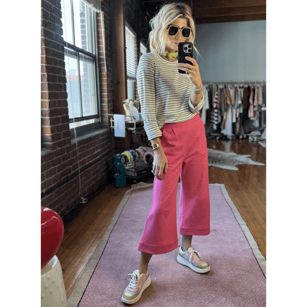 The perfect blend of Barbiecore meets vintage St. Johns, this sweater knit two-piece set is the suit that takes you from boardroom to cocktails and everywhere in between. While the pants are unlined and stretchy, the blazer is fused and lined for a more structured, but by no means stiff, fit.