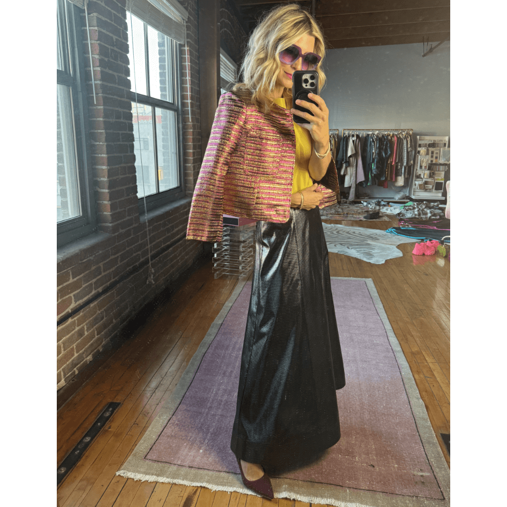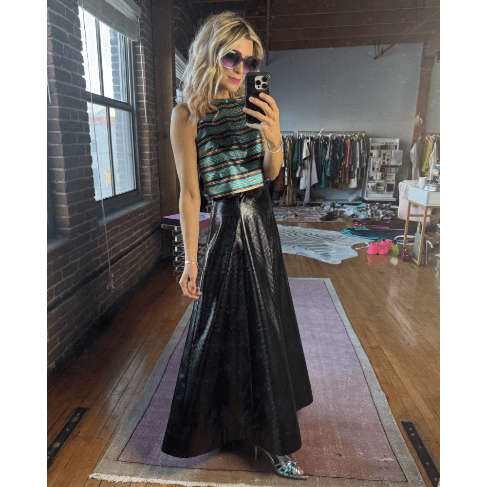 We have fallen in love with the Guest Skirt - its slight A-line design gives just the right amount of volume - not as full as the Lucinda and more flowy than our Hostess Skirt. And, if you love an elastic waist skirt but prefer not to have the gathering that is typical with that style, this flat front beauty will be perfect for you. She also has a pocket (of course), but not on the side. To keep her sleek, we moved a single pocket to the back that is large enough to hold your phone. And now she's ready to party in a subtle, shimmery black lame. Pair with one of the matching special edition Audrey Tops and celebrate in sparkling style!