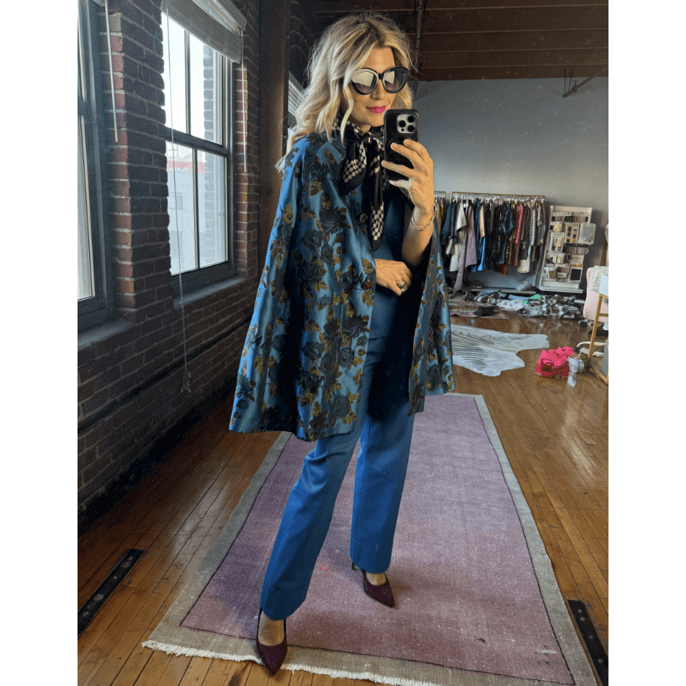 Create some drama with this look by adding our blue rose jacquard Cape and top off with a scarf. This look is dark and bold.