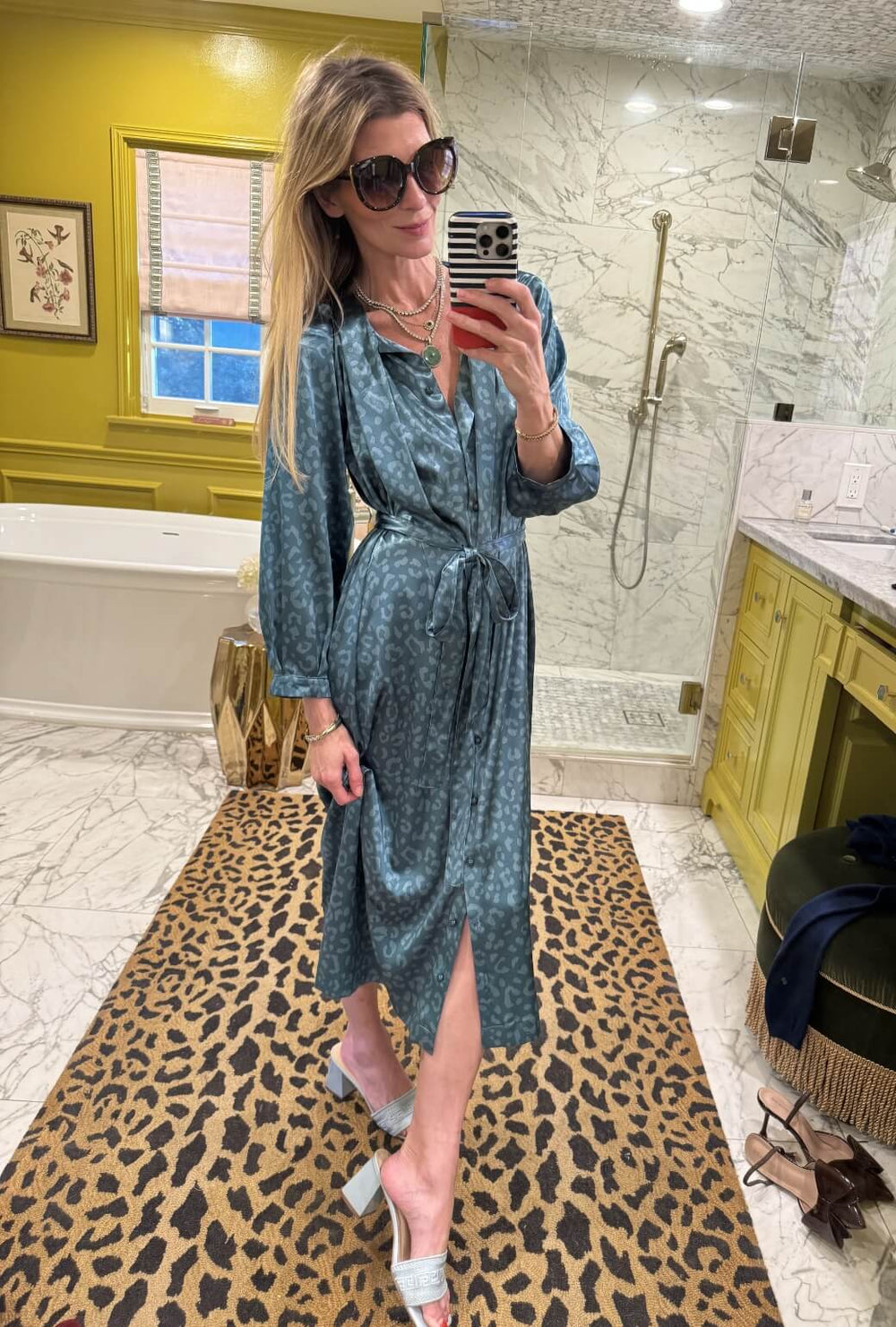 A fan favorite in aqua cheetah satin our Bow Housecoat brings classic charm with a playful twist. As perfect for poolside lounging as she is for dinner al fresco, cinch her waist and add a heel for an elevated moment, or wear her as is for an easy day around town.
