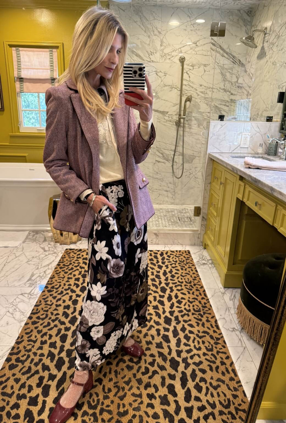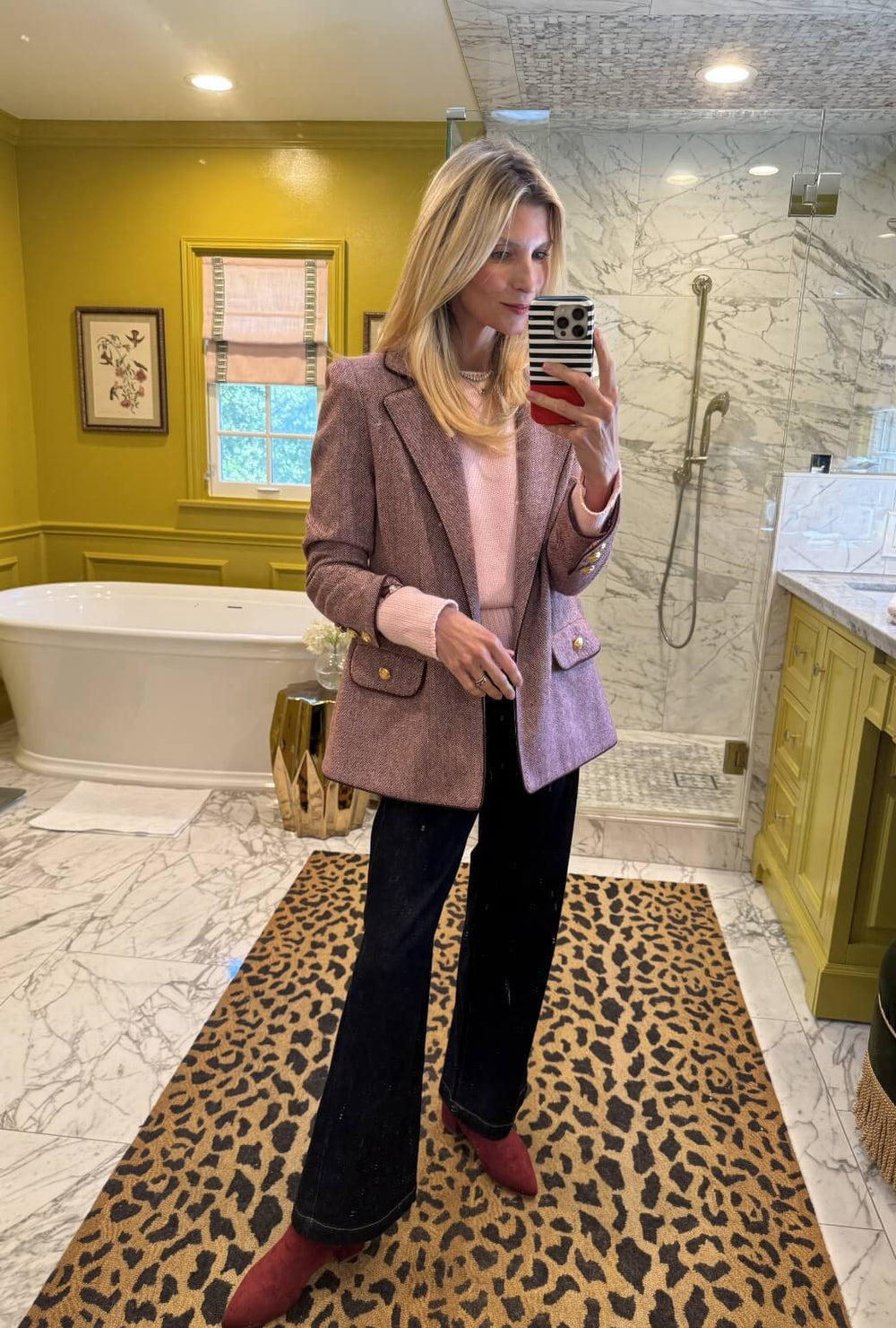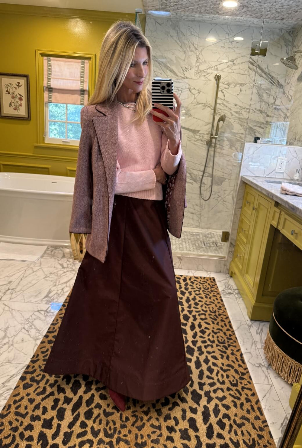 For an everyday look, the Boyfriend Blazer layered over our Jumper and paired with the Guest Skirt is a great choice. We love adding pink and burgundy to a decadent chocolate brown.