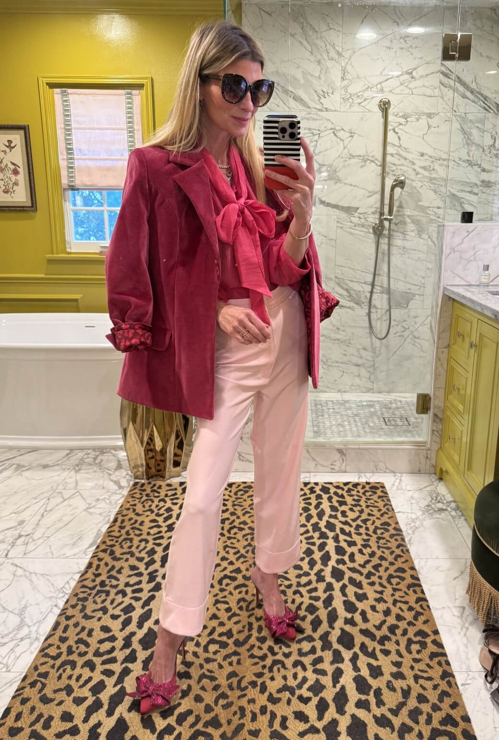 Our boyfriend blazer in pink velvet layered over the silk cropped big bow blouse and paired with pink Charlie pants creates a tonal look that’s feminine and chic. A statement-making outfit perfect for dressing up everyday moments.