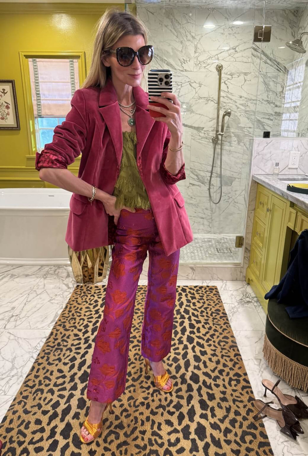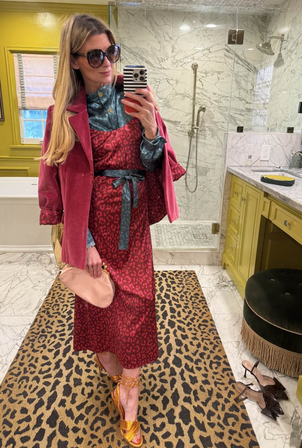 Layered perfection, when combining our aqua and pink leopard, add our pink velvet boyfriend blazer to finish the look.