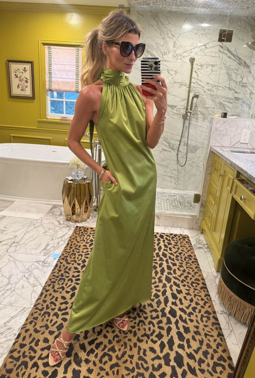 Ali’s namesake piece from the Buru x Ali Sisto Collaboration, the Ali Dress in green sateen is a stunning, flowing gown designed to make an entrance. Floor-length with a dramatic wide tie at the neck, she features an easy A-line silhouette and elegant cutaway shoulders for a touch of modern allure. Style the neckline as a bow, a knot, or tied softly in the back for versatile polish. Simplicity at its very best, she’s seasonless in green and pairs beautifully with flats or heels alike.