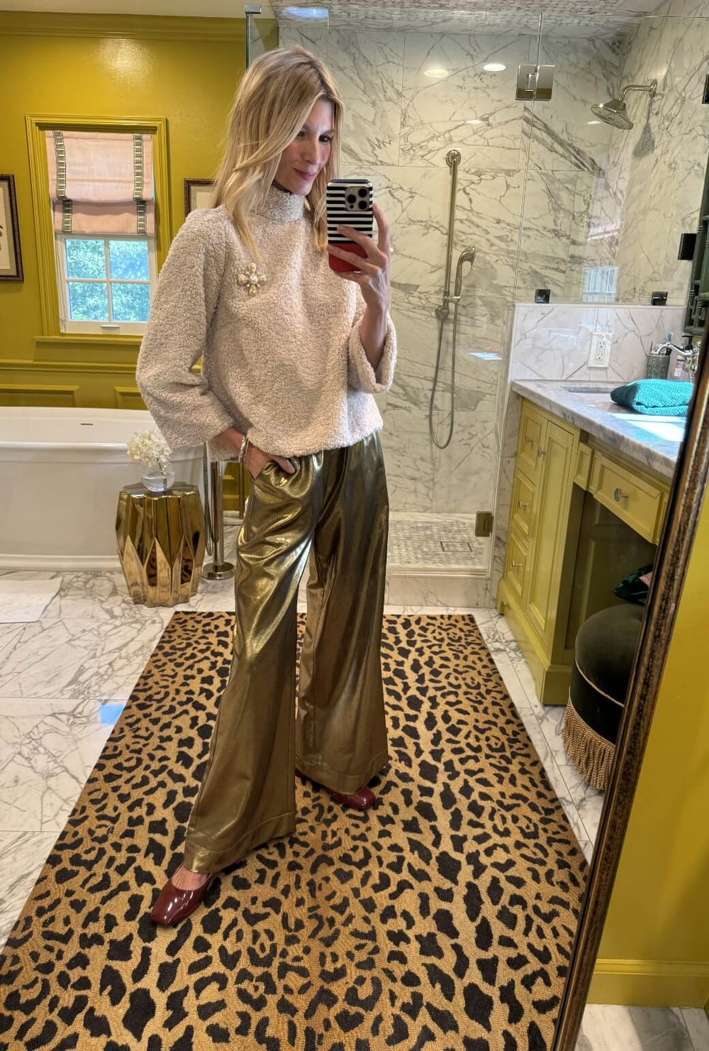 The same vintage brooch and our gold lamé trousers elevate the look of this cozy beauty. Add a gold shoe of your choice and you are ready for dinner out or al fresco cocktails, even on the chilliest of nights.