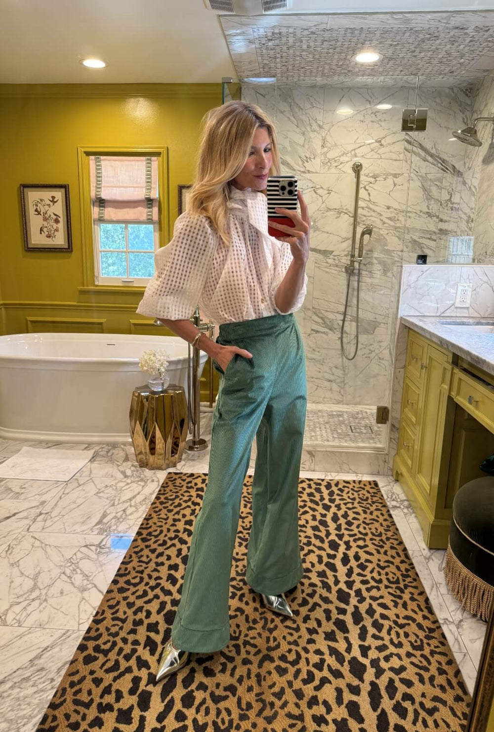 Our white sheer gingham bow blouse paired with our green corduroy High Rise Hepburn Trousers brings retro flare and versatility to this look.
