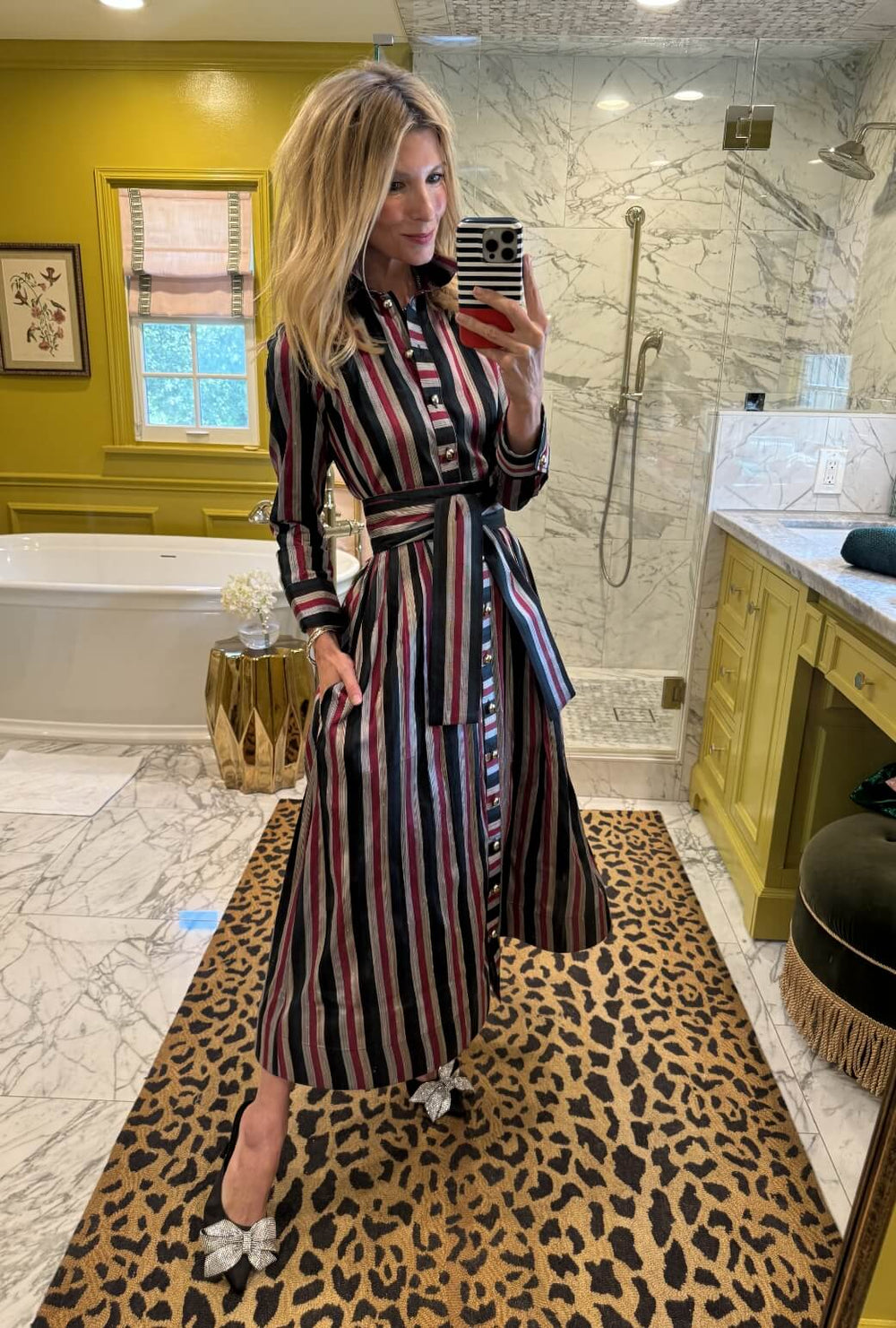 The Buru x Anna Kloots Silk Stripe Long Sleeve Shirtdress is a timeless nod to effortless sophistication. Crafted from silk woven with black, green, red, silver, and gold metallic threads, it catches the light beautifully. Designed to move seamlessly from day to night, buttoned up for polish or worn relaxed for ease, it features a classic collar and a self-tie belt with just enough structure to create a flattering cummerbund effect. A true staple for the season and beyond, it’s the kind of dress you’ll reach for year after year.