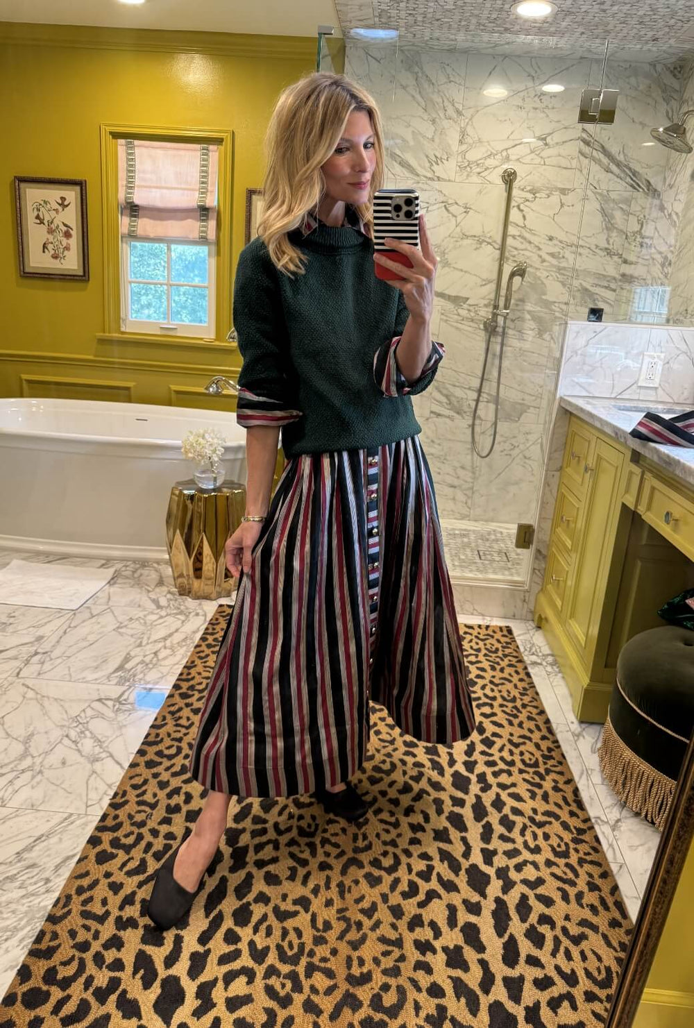 Layer our Green Bouclé Carlyle Sweater over the Buru x Anna Kloots Silk Striped Shirtdress for an effortlessly chic mix of texture and shine. Roll up the sleeves and let the metallic stripes peek through for a look that’s cozy, playful, and perfectly styled.