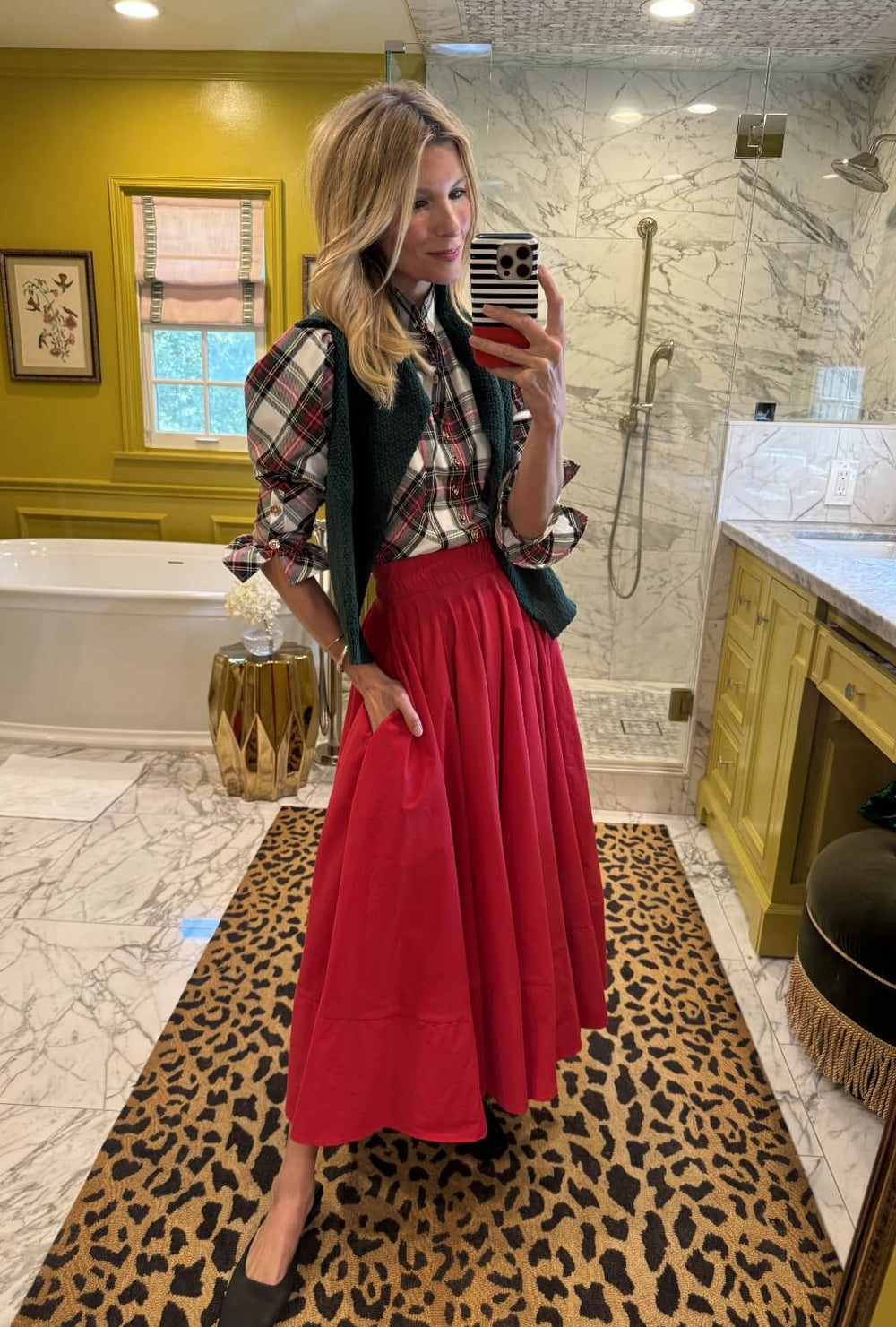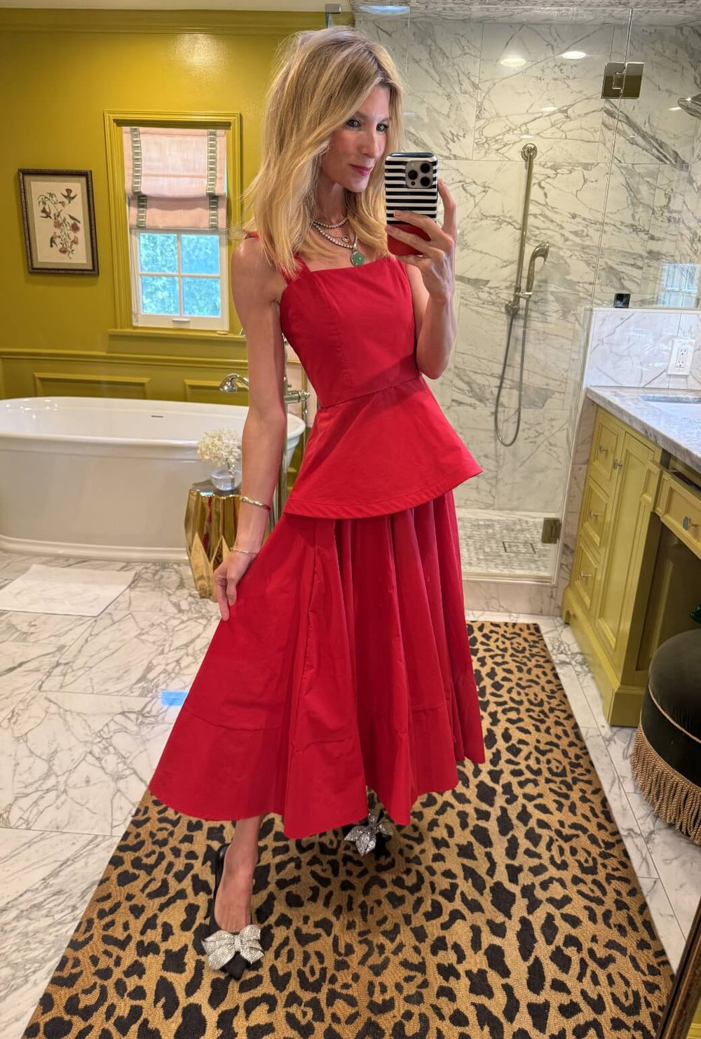 Inspired by the poodle skirts worn by Morgan’s late aunt, Lucinda Tate, the Buru x Anna Kloots Lucinda Skirt in Red Taffeta is pure vintage drama with a modern twist. Crafted from over six yards of lustrous taffeta, it’s designed to move beautifully and make an entrance. The hidden elastic waistband ensures all-day comfort without sacrificing style. Pair it with her matching Peplum Bustier for a stunning head-to-toe look that twirls like a dream and brings the perfect dose of holiday glamour.