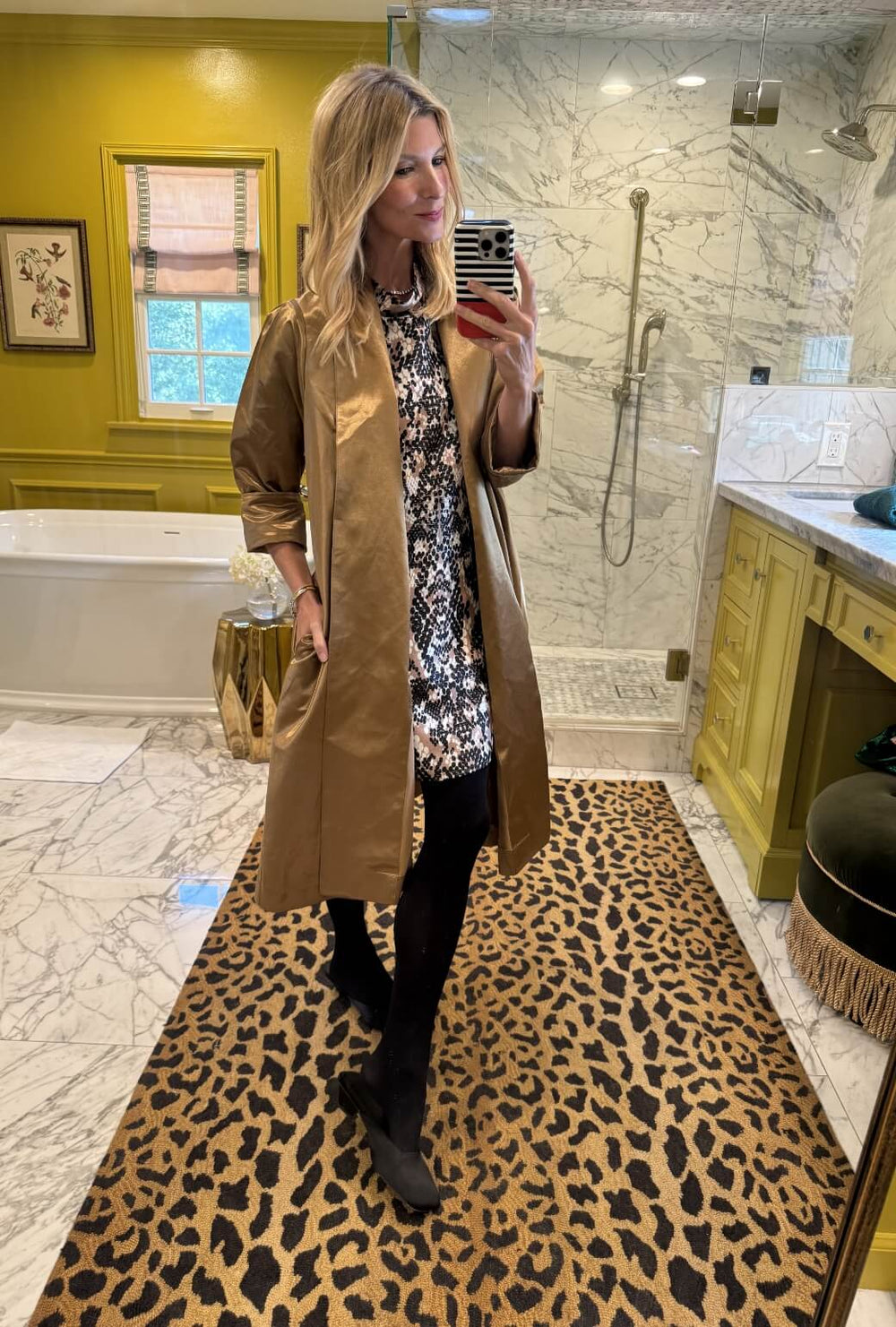 Our beloved Mod Dress silhouette in a black and bronze snake print with the perfect amount of shimmer for any feté. We love her paired with the Buru x Anna Kloots belted swing coat in bronze. Dining al fresco on a chilly night? Add a turtleneck or our Noir Bows Mel and tights for extra layers. With a retro-inspired silhouette, pockets and vintage button detailing, this beauty is timeless no matter how you style her.