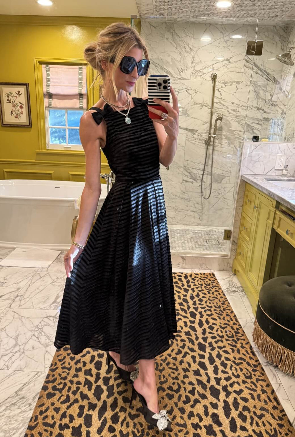 The BURU x Anna Kloots Anna Dress channels the timeless elegance of Sabrina, Anna’s inspiration for the design and a film close to Morgan’s vintage-loving heart. And when the original sold out in record time, we just knew she needed a counterpart. So meet The Anna Dress 2.0. Crafted in a sheer striped velvet with just a subtle hint of gold shimmer - she's equally as fabulous and ready for your holiday soireés, and more! This dress features a fitted bodice and a romantic sweetheart neckline as a nod to old-Hollywood glamour. With a full circle skirt that moves beautifully and removable bows at the straps, the Anna Dress is the perfect choice for any special occasion, from weddings to ringing in the new year.