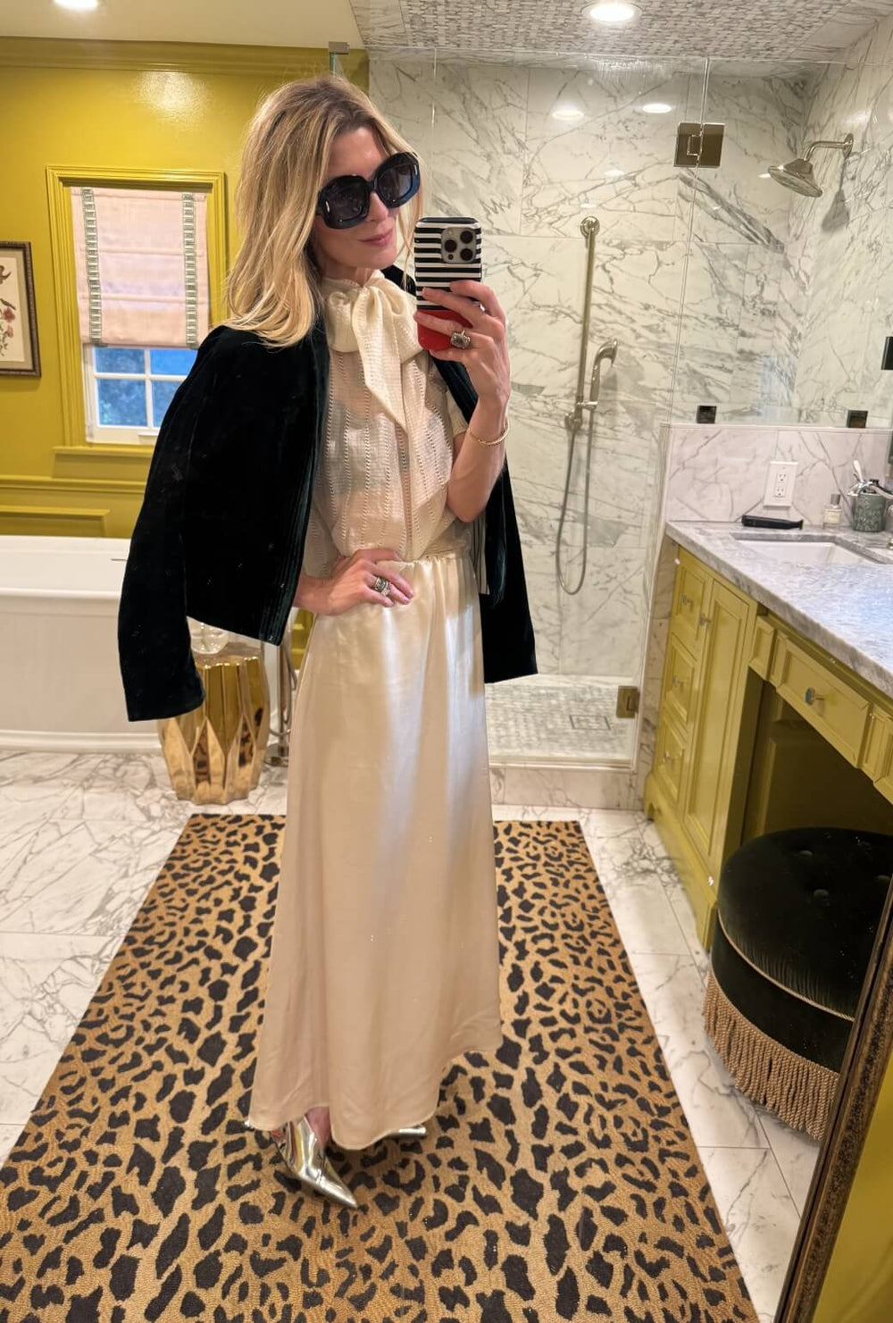 The Buru x Anna Kloots Leland Skirt paired with her matching Boxy Turtleneck equals perfection in winter white. A simple ivory flat (or heel, depending on the occasion) and a vintage brooch finishes off this elevated look.
