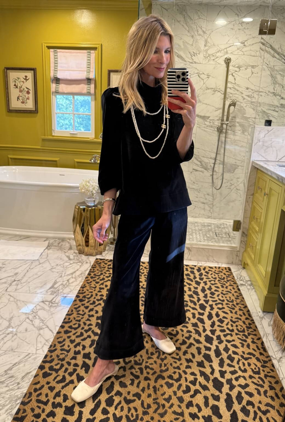Head to toe in soft velvet, this look is perfect for hosting at home or toasting the season in style. Add the heel of your choice, and you’re instantly holiday cocktail party ready.