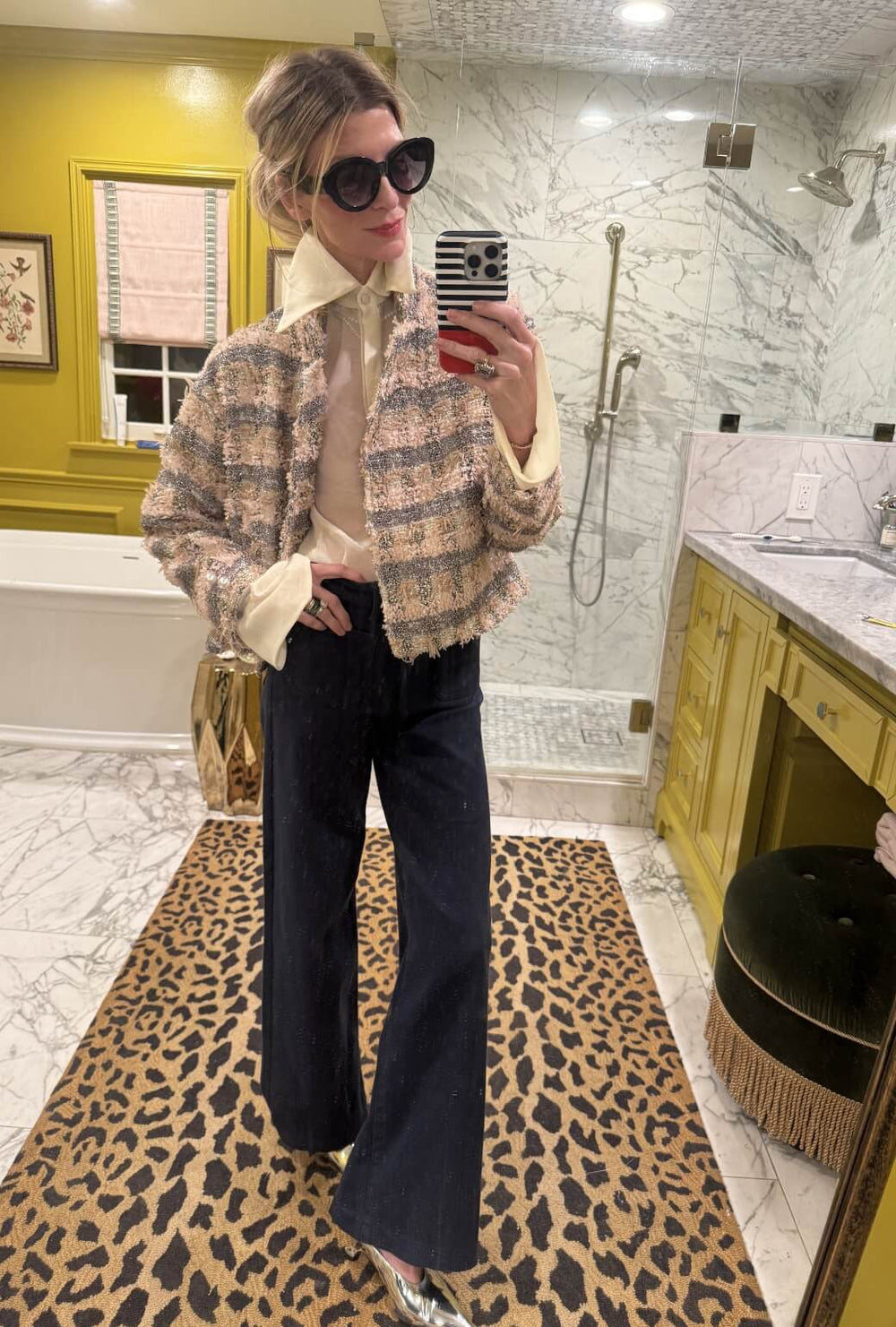 With its exaggerated collar and cuffs in sheer ivory fabric, the Battersea Blouse beautifully complements our iridescent tweed blazer and classic navy jeans for an effortlessly chic, polished look.
