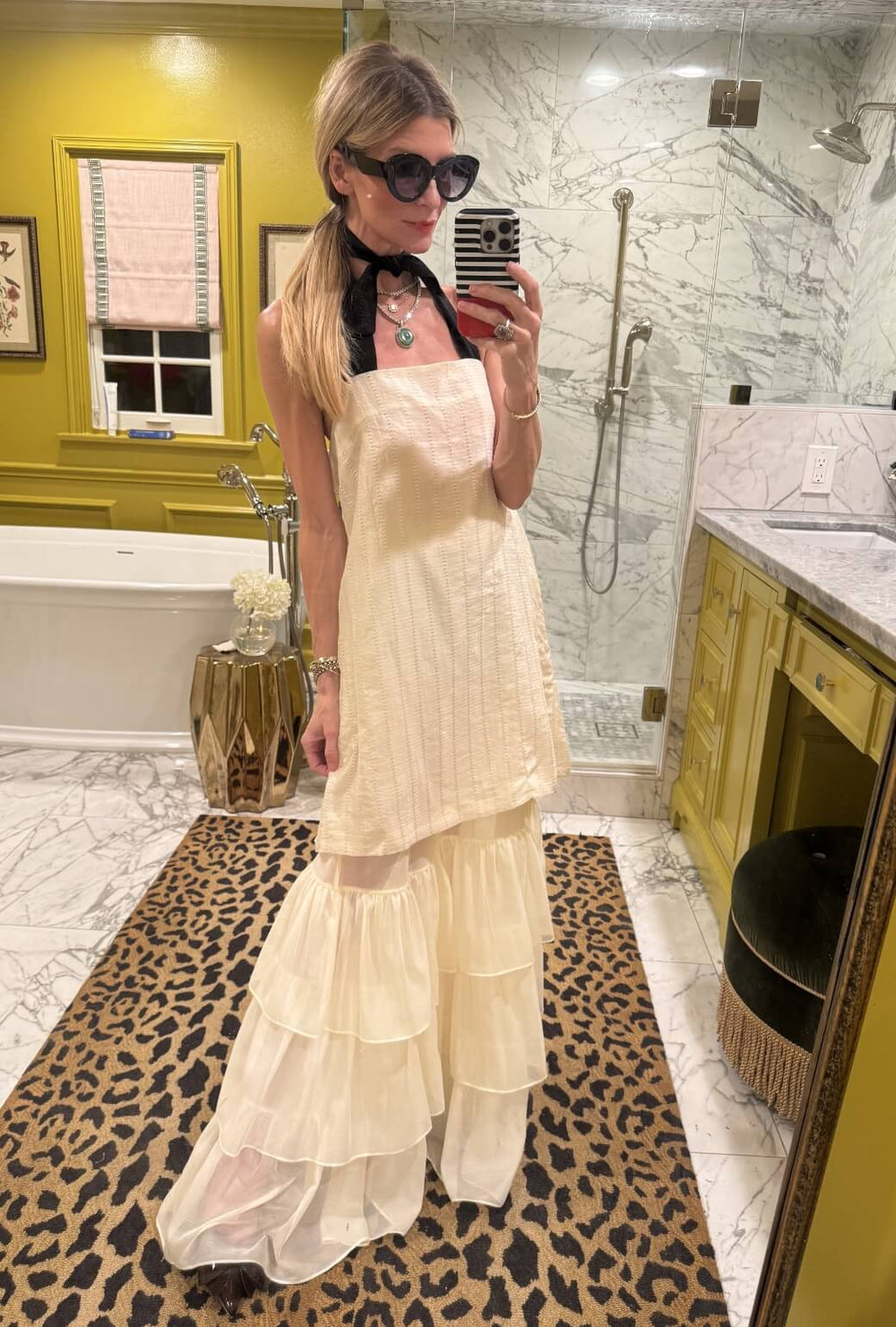 Our textured Pillar Dress is the perfect topper for the Primrose Petticoat, styled as a halter to elevate the look. A perfect unexpected fashion moment.