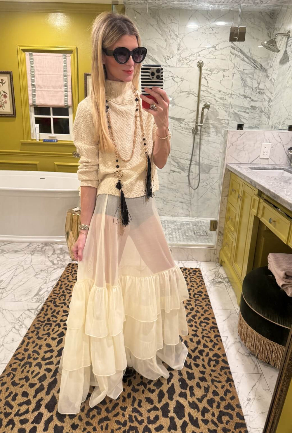 Classic with an edge. Our Primrose Petticoat is editorially styled with black high-rise briefs and our Carlyle Sweater. Finish the look by looping chic beads around your neck for an elevated touch.