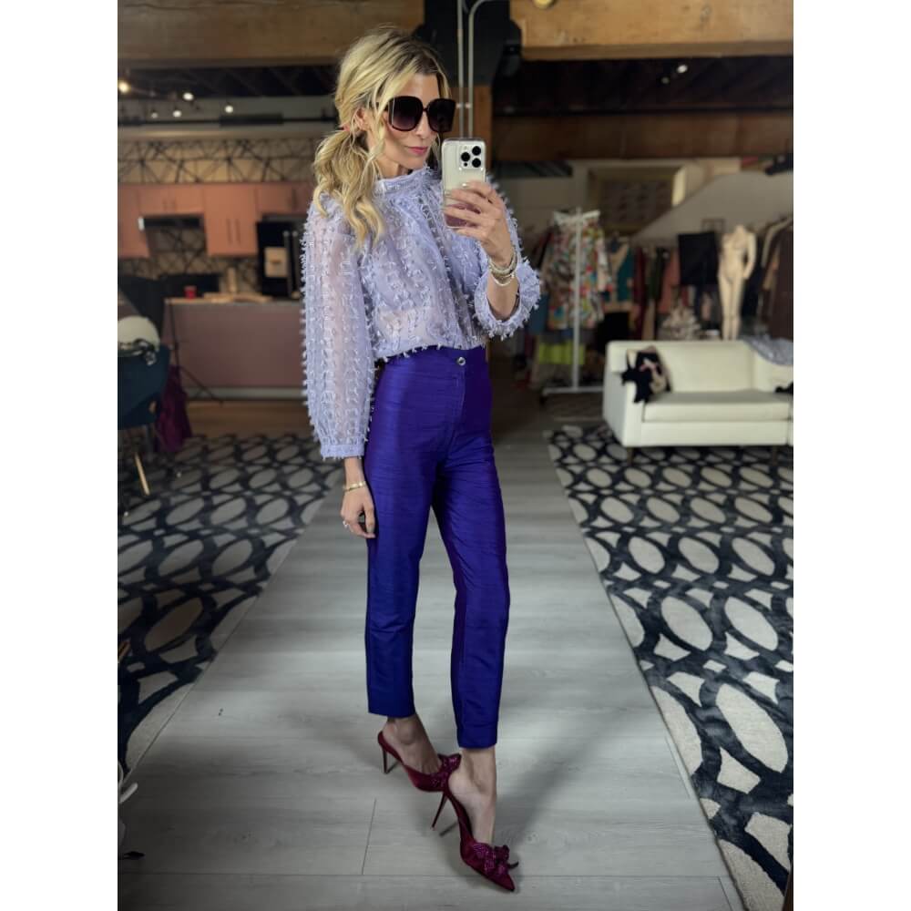 Pair the violet silk Cropped Cigar Pant with the lilac Bow Blouse for a tonal look that’s both bold and feminine. The mix of rich silk and soft texture creates a chic ensemble, perfect for everything from brunch dates to evening soirées. Our bordeaux bow mules are the icing on the cake.