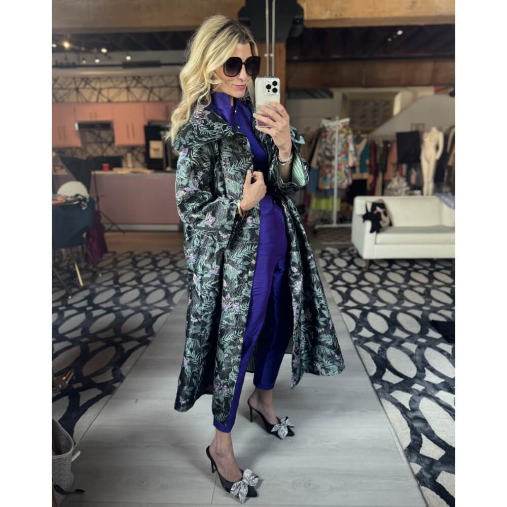 Layer the violet silk Cropped Cigar Pant with the matching Kennedy Jacket for a sleek, head-to-toe statement, then top it off with the brocade Grace Coat for an extra dose of texture and elegance. This luxe combination blends structure and sophistication, making it perfect for any occasion that calls for a little drama.