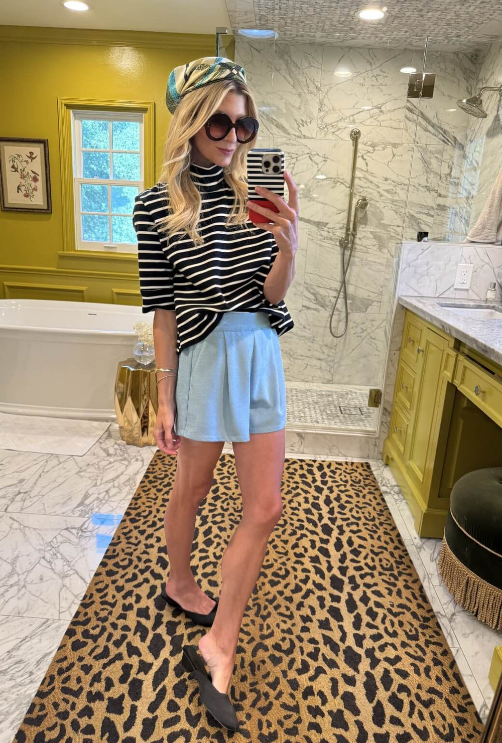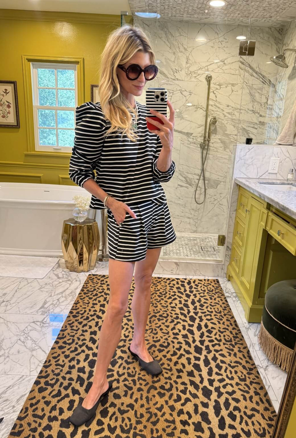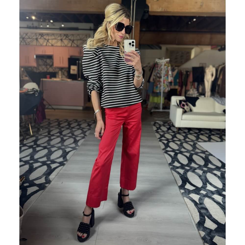 Pair the striped puff-sleeve pullover with the red Charlie Pant for a look that’s equal parts playful and polished.