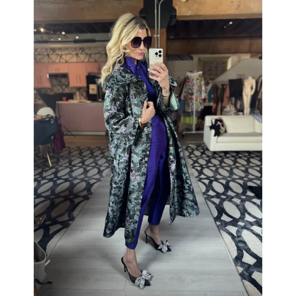 Layer the violet silk Kennedy Jacket over the matching Cropped Cigar Pants for a sleek, tonal foundation. Top it with the brocade Grace Coat for a rich mix of texture and sophistication. This chic combination is perfect for making a statement while staying timeless and polished.