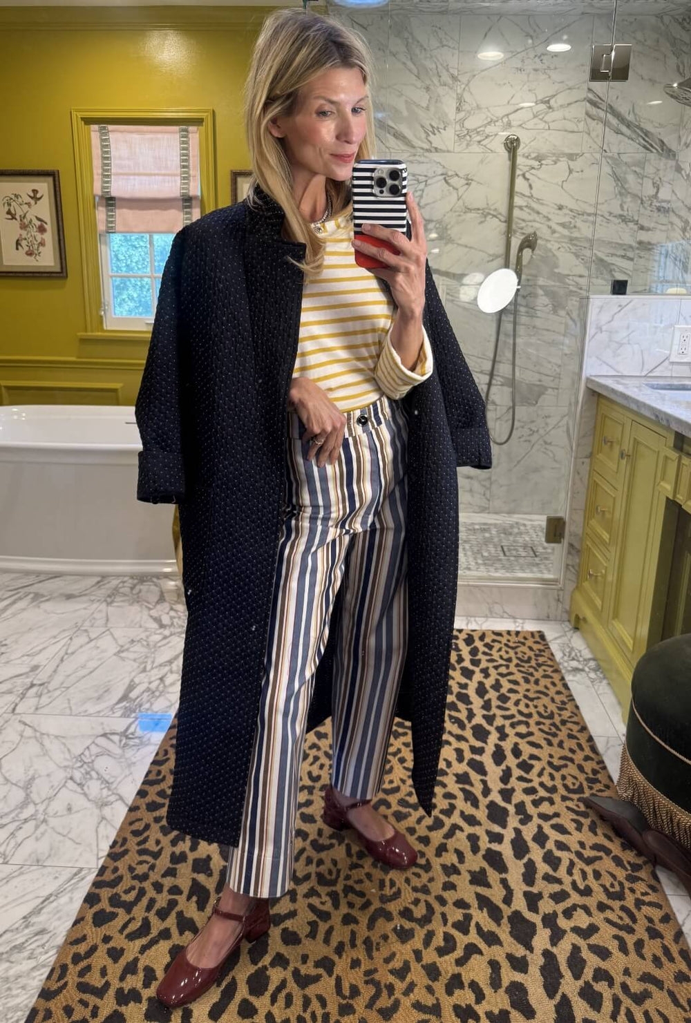 Our fan fave open car coat is the perfect layer on top of the top from our lounge set. Add the striped pants from the collection and you are ready for anything the day brings.