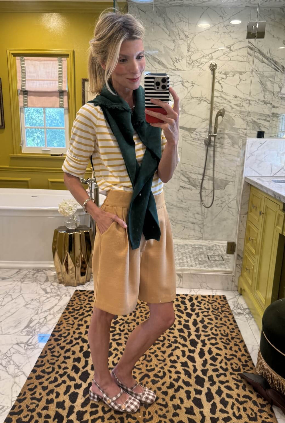 This super chic throw back look is everything we are talking about at Buru. From the marigold, white and deep green color combo to the walking shorts and sweater over the shoulders, we are smitten.