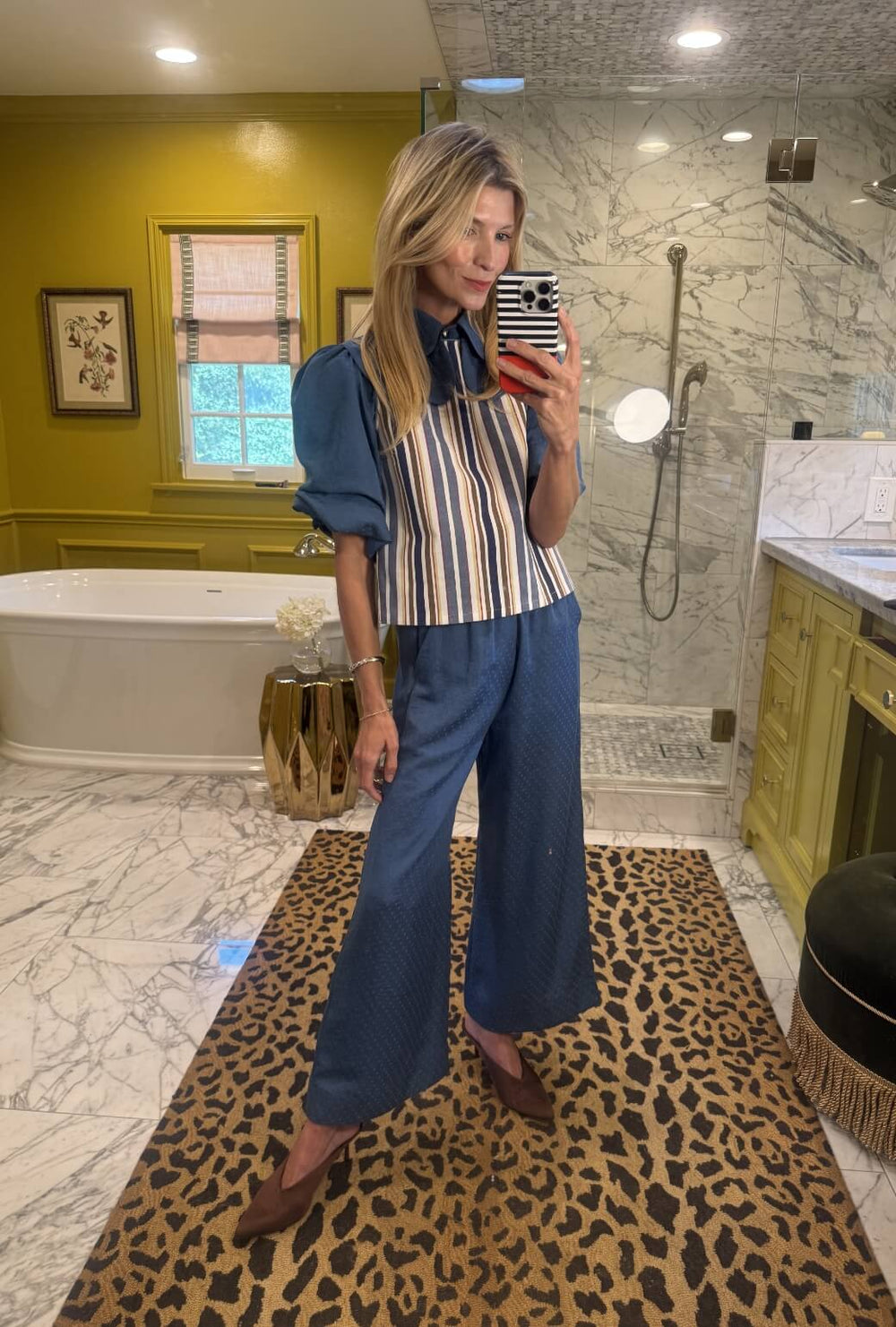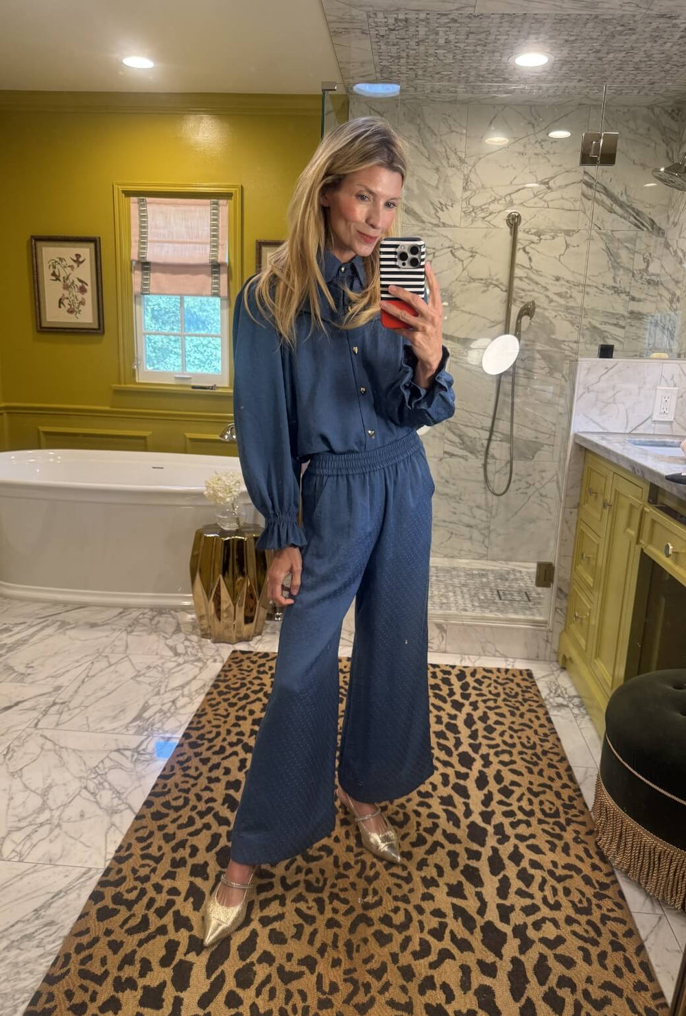Head to toe in cornflower blue has never looked so chic (or felt so comfortable). We love our ruffle blouse paired with her matching wide leg trouser for a tonal look that is comfortable to boot.