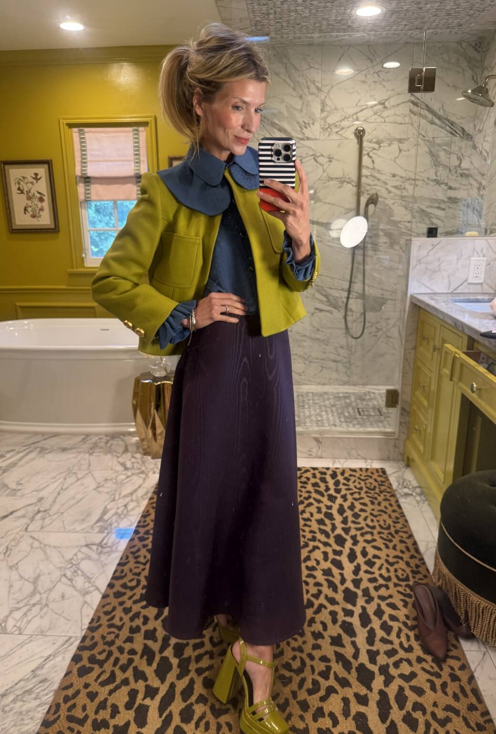 An unexpected but noteworthy trio is seen here with our updated ruffle blouse, chartreuse blazer and eggplant Laura skirt. Uber flattering and ultra versatile; might as well be a one and done style.