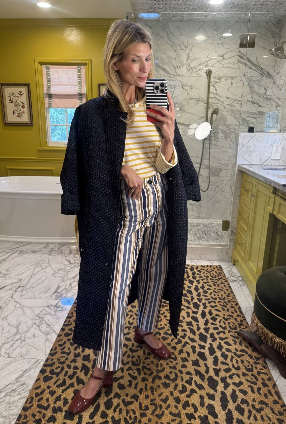Cozy stripes and our navy open car coat make for a autumn combo we cannot ignore. We love the contrast of our twill striped pants with the horizontal stripes of our newest knit set.