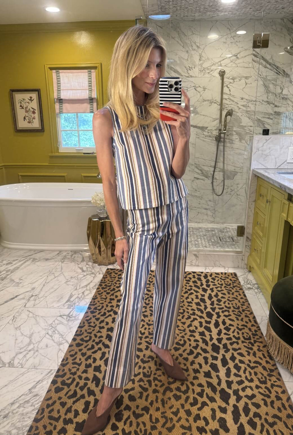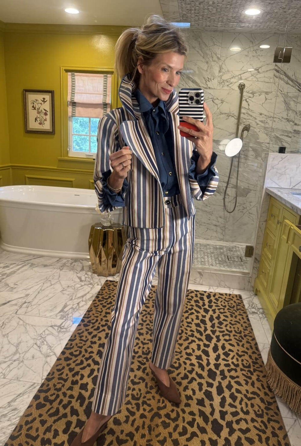 Buru's take on a Canadian tuxedo in stripes. This set paired with the matching ruffle blouse from the collection gives edgy classic vibes that we will be wearing all season.