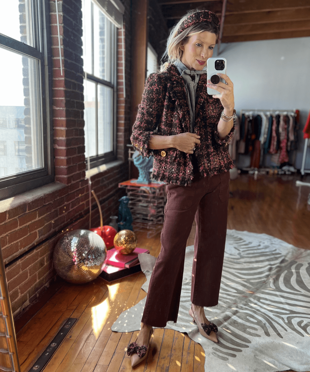 Treat this tweed blazer as your everyday jacket - she instantly adds polish to a casual ensemble.