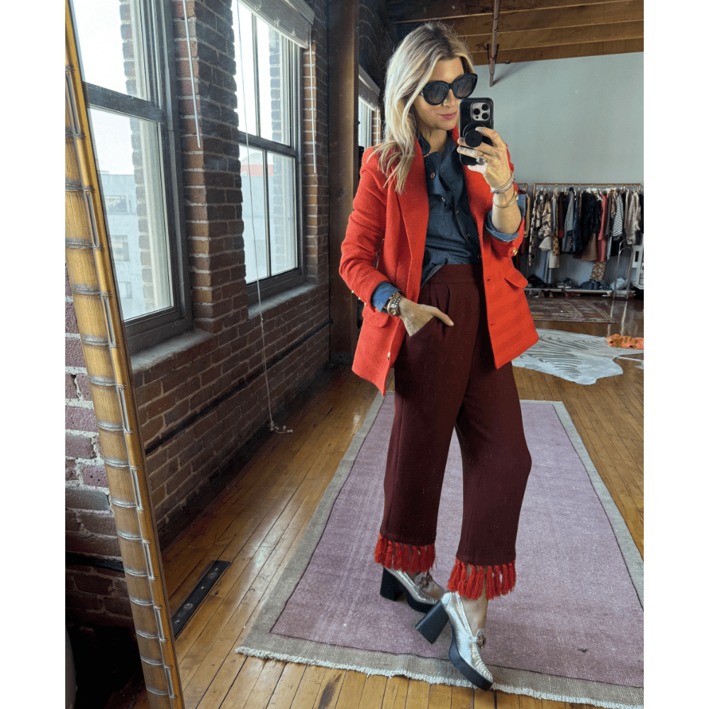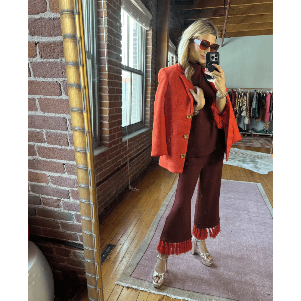 The ultimate throw-on-and-go blazer in a bold orange brings flair and color to our Tasseled Lounge Set.