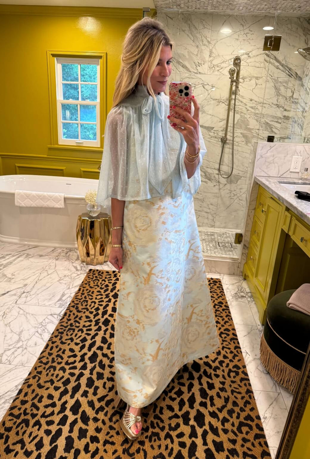 Something blue? For wedding season, add this gorgeous blue ensemble to your wardrobe. The light-as-air tulle Capelet adds a vintage feel to the Maxi Mod Dress.