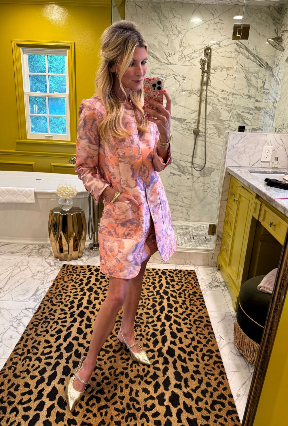 Nothing is more timeless than a shift dress and this one, inspired by the elegant style of Jackie O., is crafted in a stunning lilac and pink abstract rose flamestitch. She's the easy dress that you will reach for in any occasion - casual for daytime but chic enough to wear to dinner. The sleeveless straight silhouette falls easily from the shoulders to a raised hemline, and because of her working side buttons, she only has one pocket (but one is way better than none, right?). Layer her under the matching Walking Coat for an elevated ensemble or wear solo on warmer days.