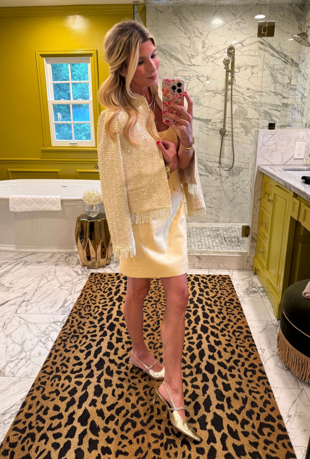 If you like a layer but don't prefer a blouse, add our sparkly Mona Lee Blazer in ivory twinkle tweed atop the structured Joan Jumper.