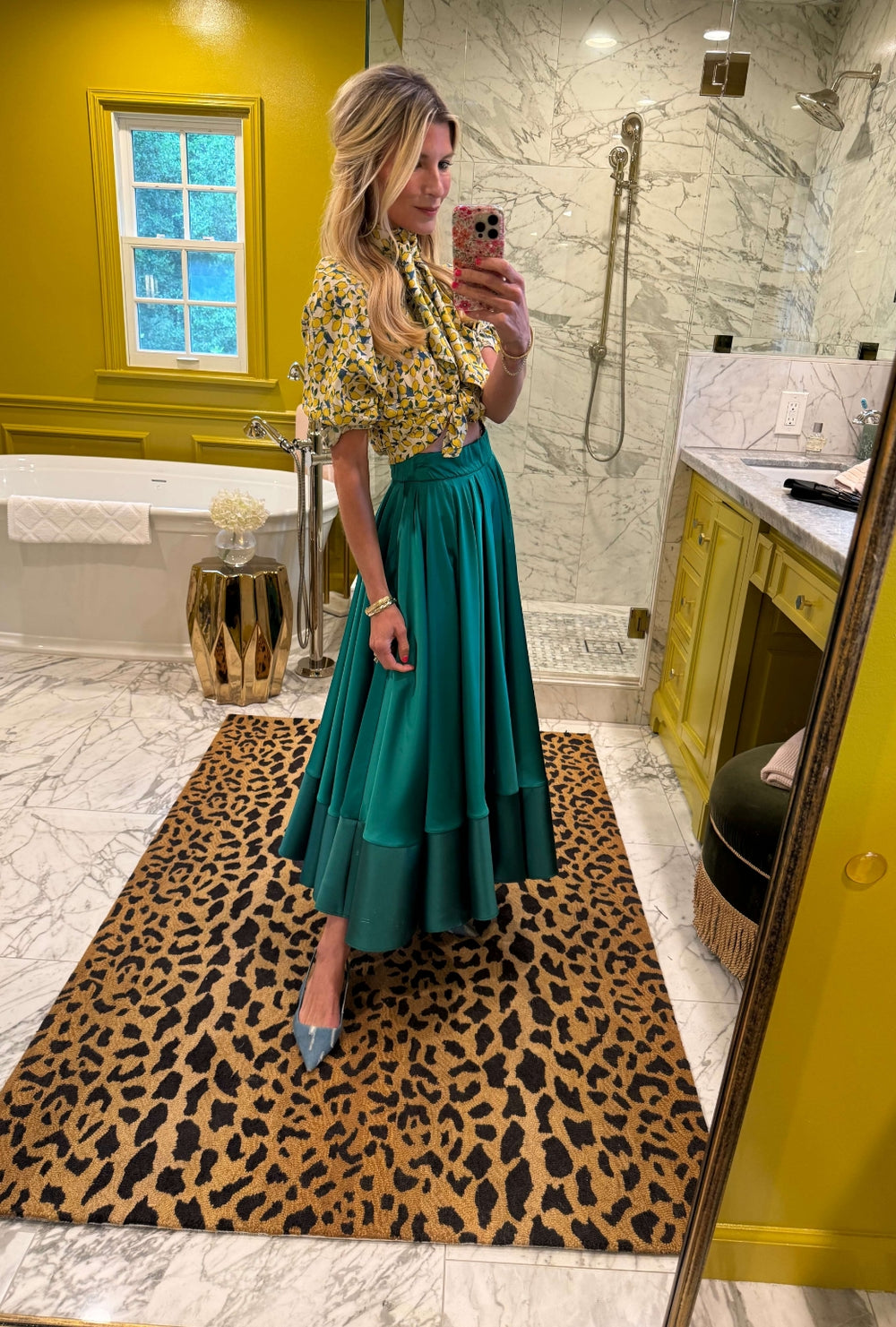 The BURU x Old Soul Etiquette Lucinda Skirt is a standout in the Celebration Collection. It serves as a heartfelt nod to Buru designer Morgan's late aunt, Lucinda Tate, whose signature poodle skirts left a lasting impression. Crafted in a classic green satin and twill, this full silhouette brings vintage charm to the modern wardrobe. With a hidden elastic waist for ease and all-day comfort, she's made to flatter—and yes, she twirls like a dream.