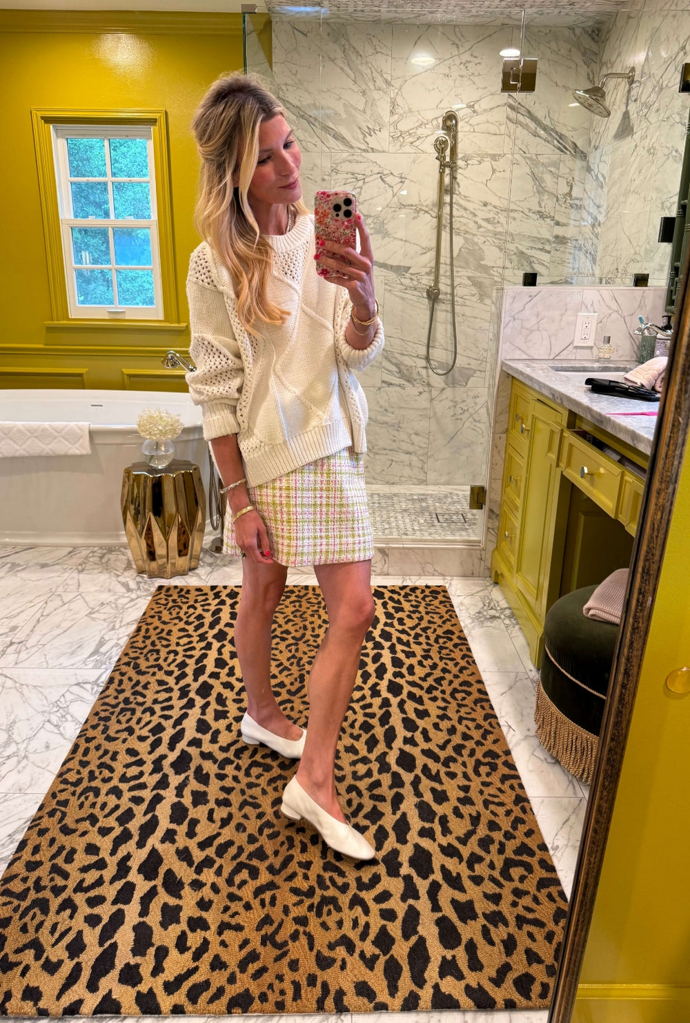 On cool summer nights, our Fisherman Sweater makes the perfect layering piece with this sweet spring tweed mini.