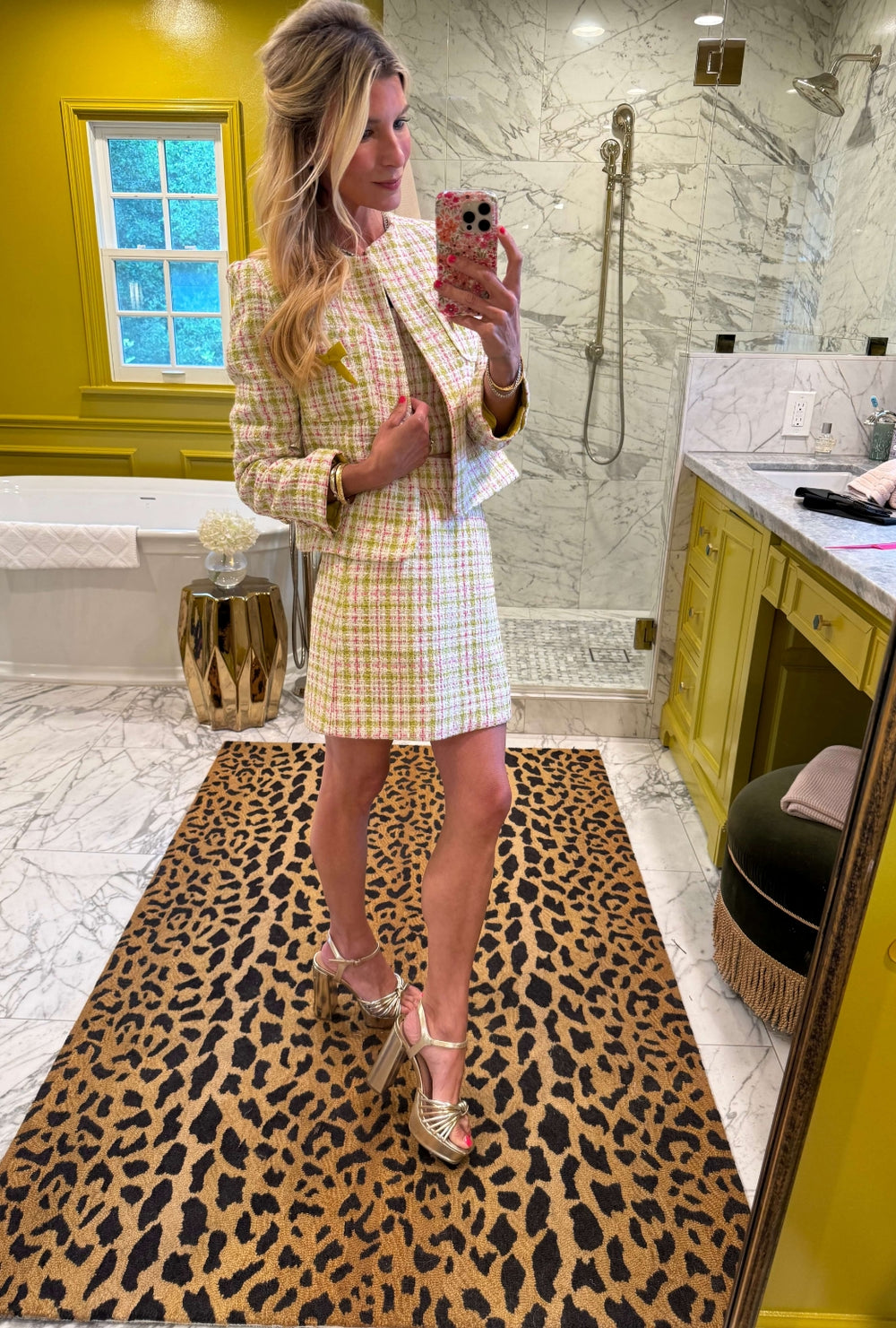 The BURU x Old Soul Etiquette Maggie Mini in spring tweed is a fresh and flirty take on a timeless classic. Crafted from a vibrant pink and green tweed, this high-waisted mini skirt adds a cheerful pop to your spring wardrobe. With its clean lines and flattering silhouette, she pairs beautifully with the matching Peplum Bustier for a playful set and creates a Blair Waldorf moment when styled with her matching bow blazer. Whether you're heading to brunch or a garden party, the Maggie Mini brings a dose of charm to any occasion.