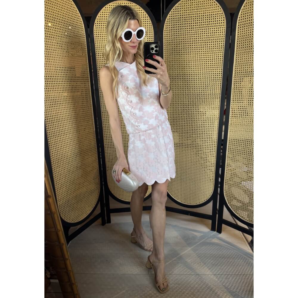For the most feminine ensemble, pair the matching Scallop Top and Scallop Mini skirt is this darling sheer pink floral. A simple sandal keeps this look classic and polished.