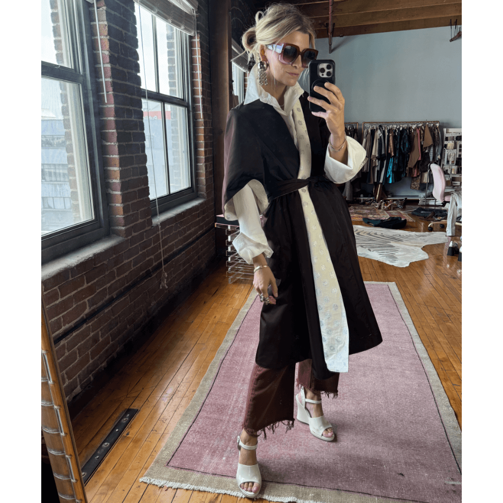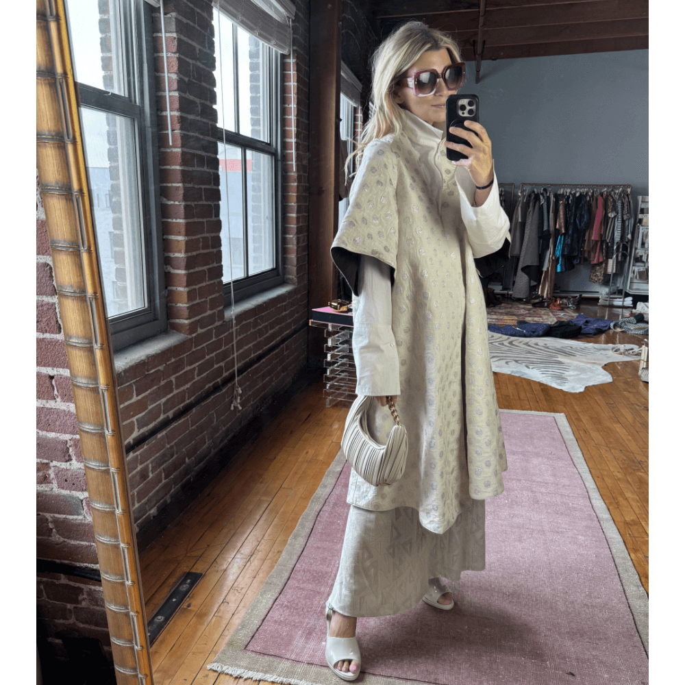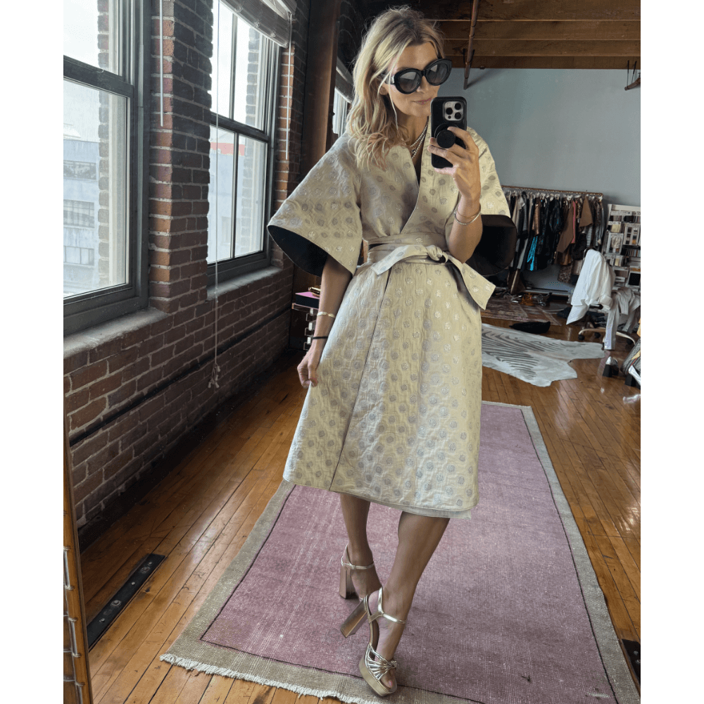 For a look that is a bit more editorial, layer the Tori Coat Dress over our Shimmer Knit Kaftan, sans the self belt. This look is easy and comfortable to wear but feels elevated in the chicest way.