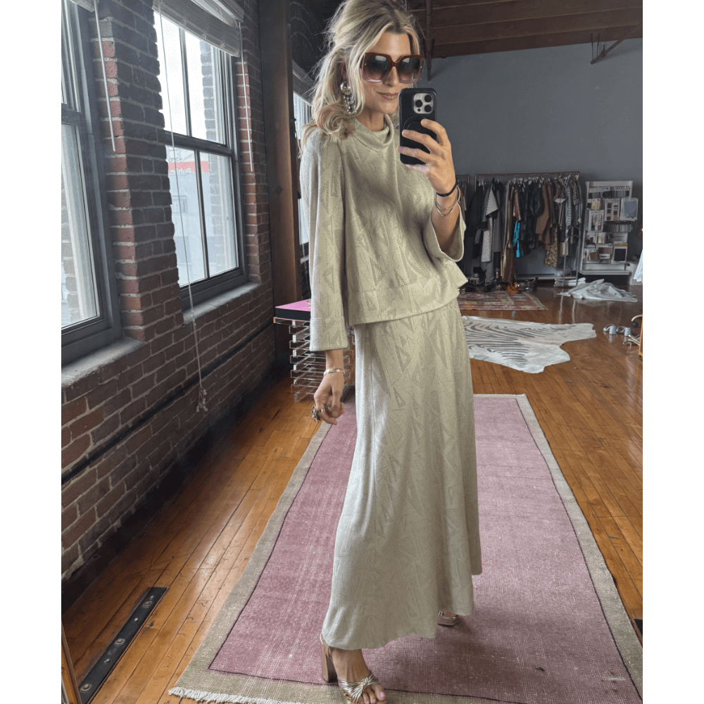 Our Leland Skirt is a fresh take on our Everyday Midi Skirt with less volume and a flat front. But do not fret, she still has a hidden elastic waist and a back pocket big enough for your phone! And we've crafted her out of the softest shimmer knit. (She has a matching top too!)