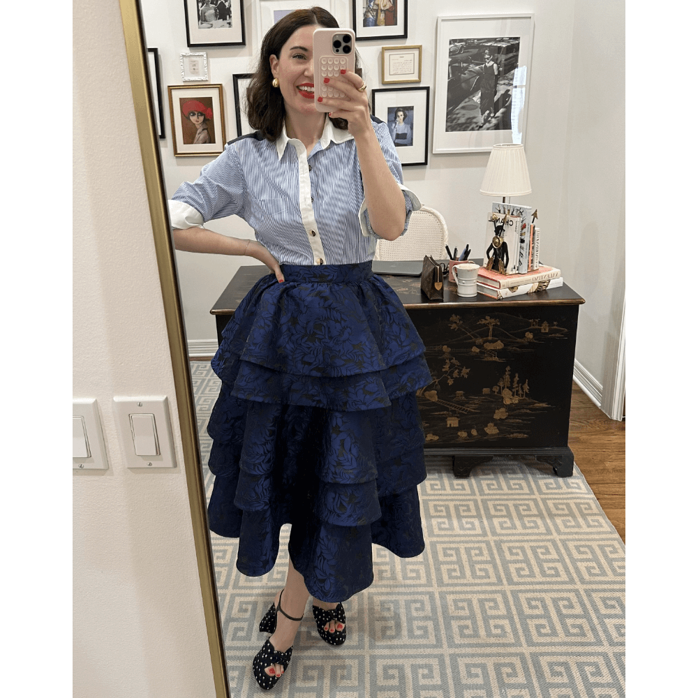 Styling the Dad Shirt tucked into our Teagan Party Skirt creates a refined, tailored look. The blue and black colorway is elegant and able to be dressed up and down.